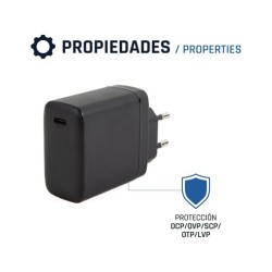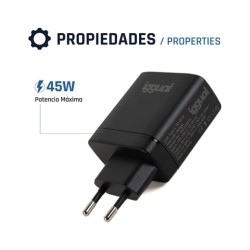 iggual. Cargador rápido 45W GAN USB-C PD, (Power dlivery). Cargador de Pared Universal. para Teléfonos móvies/Tablets etc... para Cualquier Marca de móvil. Protección sobrecalentamiento. Negro.Marca iggualTipo de conector USB tipo CDispositivos compatibles Smartwatch/Auriculares/Altavoces, SmartphoneModelos de teléfono compatibles Samsung, Xiaomi , OPPO, Pixel, Huawei ...Componentes incluidos Cargador sin cableFunción especial Universal, Power delivery, Certificaciones: CE, FCC y RoHSColor NegroVoltaje de entrada 240 VoltiosAmperaje 2,25 AmperiosTotal de puertos USB 1TODO EN CARGA: Cargador una salida USB C para una mayor velocidad. Máxima potencia de 45 W. Salidas compatibles: 5V-2.4A 12W / 9V-3A 27W / 15V-3A 45W / 20V-2.25A 45W. Además cuenta con tecnología Power delivery que ajustara la potencia de forma dinámica según las necesidades de tu dispositivo a cargar.ÚLTIMAS TECNOLOGíAS: Cargador PD (Power Delivery), la vía más veloz para conseguir la carga completa. Universal, para cualquier dispositivo compatible con PD independientemente de la marca o fabricante. PD es un protocolo de carga que permite que los cables y conectores USB-C entreguen mayores niveles de potencia a sus dispositivos, incluidos teléfonos inteligentes, computadoras portátiles y tabletas.PROTECCÓN ASEGURADA: Todos los cargadores de iggual vienen equipados con protección OCP/OVP/SCP/OTP/LVP que mantendrán nuestro cargador y dispositivos a salvo ante subidas de voltaje, cortocircuitos, exceso de temperatura etc... evitando cualquier sorpresa que nos pueda dar la toma de corriente a la que estemos conectados. Certificaciones: CE, FCC y RoHSMATERIAL INNOVADOR CARGADOR GaN: Carga más rápida con menor calentamiento. Mayor eficiencia al conseguir un menor grado de pérdida de energía. Mayor potencia de carga en menor tamaño y mucha más durabilidad, la innovación del nitruro de galio.ATENCIÓN No incluye cable. Antes de usar un cargador con cualquier dispositivo,siempre es importante verificar que el voltaje y la corriente de salida del cargador sean compatibles con el dispositivo a cargar. Si el voltaje o la corriente son demasiado altos, ppodrian dañar el dispositivo.Marca: iggualFabricante: iggualModelo: IGG318430Nombre del modelo: 45W-GaN-USB-C (PD)Dimensiones del producto: 12 x 7 x 3,5 cm, 90 gPilas: 1 AAAA (Tipo de pila necesaria)Número de modelo del producto: IGG318430Número de producto: IGG318430Aparatos compatibles: Smartwatch/Auriculares/Altavoces, SmartphoneOtras características: Universal, Power delivery, Certificaciones: CE, FCC y RoHSComponentes incluidos: Cargador sin cableNúmero de productos: 1Potencia máxima de salida de los altavoces: 180 WatiosVoltaje: 28 VoltiosPotencia eléctrica: 45 kWhFuente de alimentación: Cable eléctricoComposición de la pila de la batería: Otro elemento que no figura en la listaNúmero de puertos: 1Número de puertos USB: 1Tipo de conector: USBTipo de material: Acrilonitrilo butadieno estirenoPeso del producto: 90 g