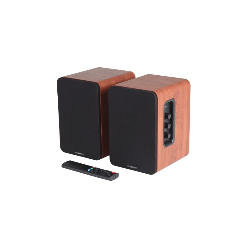 - Altavoces estéreo 2.0 Hi-Fi de escritorio Home Studio - Potencia de salida: 50W RMS (25W + 25W) - Tipología de altavoces: - 2 x rango completo de 4" / 4? (graves y medios) - 2 x tweeter de 1,25" / 4? (agudos) - Frecuencia de respuesta: 45Hz~20kHz - Impedancia: 4? - Distorsión: ≤1% - Relación señal / ruido (S/R): ≥80 dB - Procesador de señal digital de audio (DSP) integrado (3 modos: cine, música, diálogo) - Salida de graves trasera (sistema "Bass Reflex") - Alimentación: 100-240VAC/50-60Hz (DC19V-1.89A) - Control: a distancia (IR) y manual (botonera lateral) - Bluetooth 5.3 estándar (banda de frecuencia: 2,4 GHz) - Conectividad: Bluetooth 5.3, USB, 2 x RCA (estéreo), HDMI ARC, óptico digital S/PDIF TOSLINK - Potenciómetros laterales de control de volumen, graves y agudos - Incluye mando de control remoto (2 x pilas AAA 1,5V no incluidas) - Medidas: 223 alto x 150 ancho x 160 profundo (168 con frontal) mm - Materiales: MDF (cuerpo de las cajas), ABS y tela (frontales desmontables) - Color: madera veteada en tonos caoba - Incluye: - Manual de instrucciones - Adaptador AC/DC - Mando de control remoto - Cable estéreo 2 x RCA a 1 x mini jack 3,5 mm - Cable RCA a RCA (altavoces R y L)