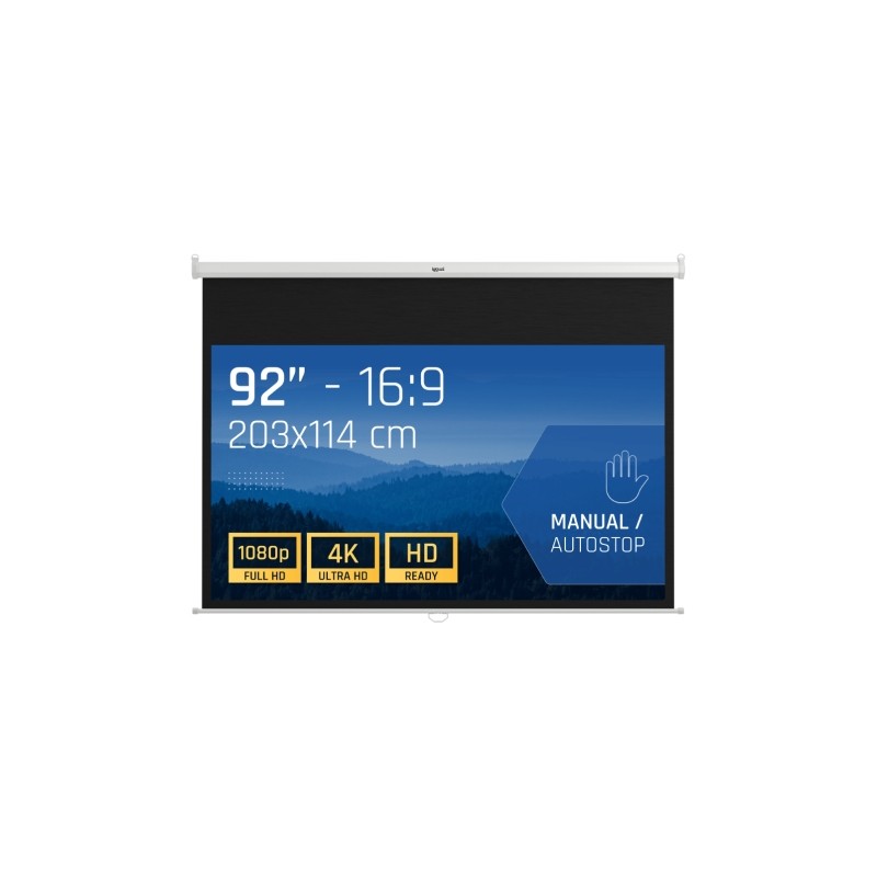 Características - Pantalla de proyección para techo o pared, indicada para todo tipo de proyecciones - Área visible: 203x114 cm - Ángulo de visión: 180º - Formato: 16:9 - Tela: blanca mate - Factor de ganancia: 1.0 - Auto-Stop: ajustable a cualquier altura - Material cajetín: acero - Puede colocarse en techo o pared - Trasera negra opaca - Bordes negros de 3 cm a la izquierda y derecha - Fácil montaje - Alta calidad y durabilidad - Ideal para cine en casa y salas de conferencias - Ideal para cualquier tipo de proyector, SVGA, XGA, 3D, HD, Full HD y 4K Especificaciones Desempeño Diagonal: 2,34 m (92") Relación de aspecto nativa: 16:9 Altura de la pantalla visible (A): 114 cm Anchura de la pantalla visible (A): 2,03 m Tipo de unidad: Manual Superficie de la pantalla: Blanco mate Formato: amplio Ganancia de pantalla: 1,0 Ángulo de visión: 180° Diseño Tipo de montaje: Techo/pared Soporte negro: Si Bordes: Si Fronteras: 3 cm Instalación simplificada: Si Color del producto: Blanco Color de la carcasa: Blanco Material: Tela, Acero Rueda de reenvio: No Peso y dimensiones Ancho: 2207 mm Altura: 1646 mm Empaquetado Cantidad por paquete: 1 pieza(s)
