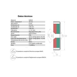 Iman en recipiente avellanado 20x6mm Neodimio FA-8.9 KgDiám. recipiente D 20 mmAlto total H 6 mmTolerancia +/- 0,1 mmRevestimiento Niquelado (Ni-Cu-Ni)Magnetización N38Fza. sujec. aprox. 8,9 kg (aprox. 87,3 N)Fuerza de desplazamiento aprox. 1,8 kg (aprox. 17,5 N )Temperatura de servicio máx. 80°CPeso 11 g