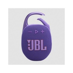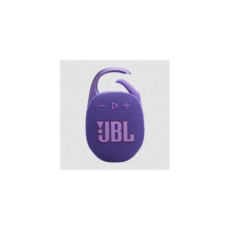 Altavoz JBL Clip 5 LilaReferencia: JBLCLIP5-PURPLESonido JBL Pro ultraportátilMosquetón rediseñadoHasta 12 horas de reproducción más 3 horas extra con Playtime BoostSonido JBL Pro ultraportátilNo dejes que su pequeño tamaño te engañe. El JBL Clip 5 brinda una excelente experiencia musical, ofreciendo un gran sonido JBL Pro con graves impactantes. Tus amigos no se van a creer que un sonido tan potente pueda salir de un altavoz JBL Pro tan pequeño.Mosquetón rediseñadoEl mosquetón, completamente rediseñado e integrado, tiene una abertura mucho más ancha que lo hace aún más portátil. Puedes enganchar el Clip 5 en cualquier sitio, desde la mochila hasta la trabilla del cinturón, y llevar tu música contigo todo el día y a todas partes.Hasta 12 horas de reproducción más 3 horas extra con Playtime BoostNo te preocupes por cosas sin importancia como cargar la batería. El Clip 5 te da hasta 12 horas de tiempo de reproducción con una sola carga. Solo tienes que pulsar Playtime Boost para prolongar el tiempo de reproducción y aumentar la duración de la batería hasta 3 horas. Esta función sintoniza y optimiza el rendimiento para obtener un sonido más alto y nítido.