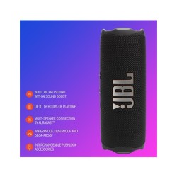 JBL Flip 7, Altavoz Bluetooth portátil inalámbrico Potente, 16h de batería, Resistente al Agua IP68, a Prueba de Polvo y caídas, Sonido Pro, AI Sound Boost, Compatible con Auracast, VioletaMarca JBLPotencia de salida máxima del altavoz 25 WatiosRespuesta de frecuencia 20 KHzTecnología de conectividad BluetoothModo de salida de audio EstéreoVoltaje de entrada 3,63 VoltiosTipo de montaje Montaje en mesaMaterial PlásticoNombre del modelo JBL Flip 7Tipo de altavoz Altavoz portátilLleva la fiesta contigo: disfruta de hasta 14h de música con una sola carga gracias al altavoz portátil impermeable JBL Flip 7 y obtén 2h adicionales con Playtime BoostSonido potente: benefíciate de graves potentes y claros, incluso a volumen alto, y de agudos nítidos gracias al diseño de la cúpula del altavoz, la tecnología AI Sound Boost ofrece un rendimiento acústico con menos distorsiónLa banda sonora de tu vida: deja caer el JBL Flip 7 desde 1 m, llévalo a la ducha o cúbrelo de polvo sin que acabe la música, úsalo para fiestas épicas, no solo para impresionar a la gentePara los amantes de la aventura: haz que cualquier experiencia sea memorable, desde fiestas en la playa hasta reuniones en casa con este altavoz para teléfono portátil, conéctalo a varios altavoces Auracast y aumenta el sonidoTransportalo como te apetezca: el sistema PushLock cuenta con accesorios intercambiables, engancha, ata o sujeta tu altavoz gracias a la correa para la muñeca y el mosquetón incluidos