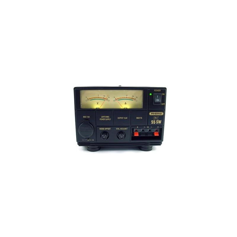 Jetfon PC-55 SWREF: 1399EAN: 8435550803689Fuente de alimentaciónFuente de alimentación estabilizadaCortocircuitableInstrumentos: Voltímetros y Amperímetro analógico2 salidas de Tensión: una tipo mechero y otra tipo banana (máxima potencia)Conmutación para trabajo fijo (13,8 VCC) y regulable (8 – 15 VCC)55 Amperios (continuo 50 A.)Supresor de ruidoVentilador refrigeración automáticoDimensiones: 12.5 (Al) x 17 (A) x 26 (P) cmPeso: 1.982 g (2.294 g. con embalaje)