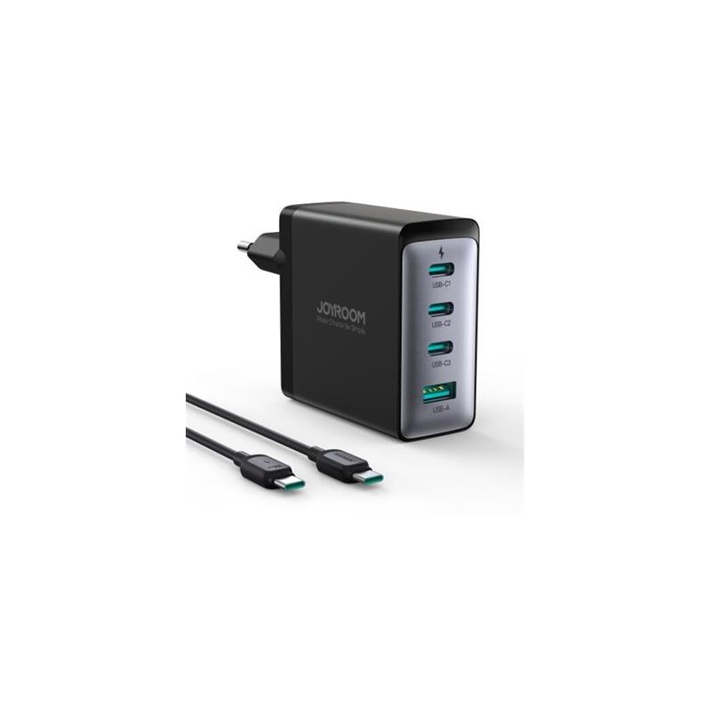 CARGADOR DE RED JOYROOM JR-TCG04EU 3XUSB-C 1XUSB-A + USB-C/USB-C 100W CABLE 1,2M NEGROCargador GaN Joyroom JR-TCG04EU hasta 100W con 3 puertos USB-C y 1 USB-A + cable USB-C / USB-C 100W - negroEl cargador Joyroom JR-TCG04EU garantiza una carga estable con menos generación de calor gracias a la tecnología GaN, un material semiconductor de última generación y altamente integrado. La potencia de 100 W y la compatibilidad con varios protocolos de carga rápida garantizan una carga instantánea para una variedad de computadoras portátiles, tabletas y teléfonos. Las certificaciones CE, UKCA, FCC y RoHS garantizan un uso seguro. Obtienes un cable de 1,2 m con conectores USB-C y USB-C.Ventajas clave del cargador GaN Joyroom JR-TCG04EU:Emite menos calor al cargar . El cargador se basa en la tecnología GaN, que garantiza una carga estable.Cargará tus dispositivos en poco tiempo . Con hasta 100 W de potencia, el cargador proporciona carga rápida para una variedad de computadoras portátiles, tabletas y teléfonos.Puede cargar cuatro dispositivos simultáneamente . Con 3 puertos USB-C y 1 puerto USB-A, puede cargar rápidamente cuatro dispositivos al mismo tiempo.Admite varios protocolos de carga rápida. El cargador es compatible con Power Delivery 3.0, PPS, Quick Charge 3.0, Samsung AFC y Huawei FCP/SCP.Garantiza la seguridad . El cargador ha pasado las certificaciones CE, UKCA, FCC y RoHS.Recibirás un cable incluido . Junto con el cargador recibirás un cable con conectores USB-C y USB-C con una longitud de 1,2 metros.Especificaciones:Marca: JoyroomModelo: JR-TCG04EUEntrada: CA 100-240 V, 50/60 Hz, 1,5 A (máx.)Producción:USB-C 1: 5 V / 3 A , 9 V / 3 A, 12 V / 3 A, 15 V / 3 A, 20 V / 5 A.USB-C 2: 5V/3A, 9V/3A, 12V/3A, 15V/3A, 20V/5APPS: 3,3-11 V/5 A.USB-C3: 5V/3A, 9V/3A, 12V/2,5A, 15V/2A, 20V/1,5AUSB-A: 5V/3A, 9V/3A, 10V/2,25A, 20V/1,5AUSB-C 1 + USB-C 2/3: 65W + 30WUSB-C 2 + USB-C 3: 65W + 30WUSB-C 1/2 + USB-A: 65W + 30WUSB-C 3 + USB-A: 20WUSB-C 1 + USB-C 2 + USB-C 3: 45W + 30W + 20WUSB-C 1 + USB-C 2 + USB-A: 45W + 30W + 22,5WUSB-C 1/2 + USB-C 3 + USB-A: 65W + 20WUSB-C1 + USB-C 2 + USB-C 3 + USB-A: 45W + 30W + 20WPotencia de salida total: 100W (máx.)Material: PC ignífugaTamaño: 67,3x35x104mmPeso: 220 gramosDe color negroIncluye: cable USB-C / USB-C de hasta 100 W y 1,2 m de longitudTecnología GaN modernaEl cargador Joyroom JR-TCG04EU utiliza la última tecnología GaN. Esto garantiza una carga estable y eficiente al tiempo que minimiza la generación de calor. Obtiene la confianza de que sus dispositivos se cargan de forma segura y eficiente.Carga rápida y eficienteEl cargador proporciona una carga rápida y eficiente con hasta 100 vatios de potencia para muchos tipos de dispositivos: desde portátiles hasta tabletas y teléfonos inteligentes. Ahorre tiempo y obtenga la comodidad del uso diario.Multitarea y versatilidad¡Carga hasta cuatro dispositivos simultáneamente! el diseño de 4 puertos hace que el cargador sea extremadamente práctico. Ya no tendrás que esperar por un outlet gratuito.Soporte para varios protocolos de cargaEl cargador admite varios protocolos de carga rápida: Power Delivery 3.0, PPS, Quick Charge 3.0, Samsung AFC y Huawei FCP/SCP. Obtienes compatibilidad y velocidad de carga, independientemente del dispositivo que utilices.Calidad y seguridad certificadasCon las certificaciones CE, UKCA, FCC y RoHS, tiene la seguridad de que sus dispositivos se cargan de forma segura. Cada cargador se prueba minuciosamente antes de que llegue a sus manos.