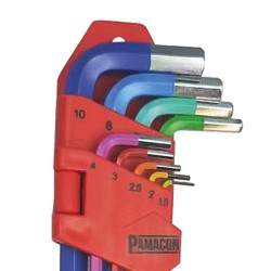 • Juego de 9 llaves tipo allen con punta de bola hexagonales en sistema métrico 1.5, 2, 2.5, 3, 4, 5, 6, 8, 10 mm.• Fácil identificación de las medidas por color.• Superficie resistente al óxido y a la corrosión.• Superficie de agarre antideslizante, agradable al tacto.• El extremo de la bola funciona en ángulos de hasta 25º.