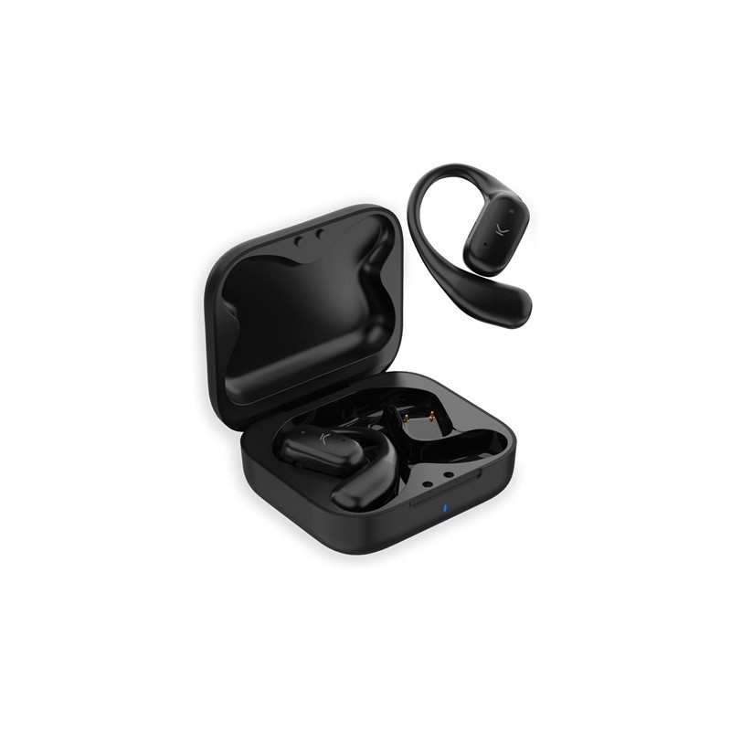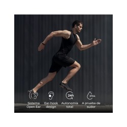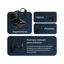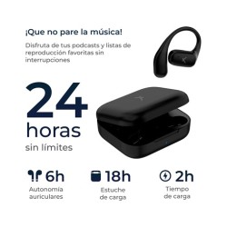 KSIX Cosmos Auriculares Inalámbricos Deportivos Open-Ear, 24 Horas Autonomía, Control táctil, Llamadas, Asistentes de Voz, Negros [Clase de eficiencia energética A]Marca KSIX smart your techColor NegroColocación en las orejas Canal auditivoFactor de forma SupraauralesImpedancia 7 OhmiosControl de ruido NingunoSensibilidad 7 OhmioConector para auriculares Ninguno (inalámbrico)Nombre del modelo 1Tecnología de conectividad InalámbricoSISTEMA OPEN EAR: Los auriculares inalámbricos Cosmos aportan libertad auditiva al mantenerte en contacto con el entorno mientras disfrutas de tu música y atiendes llamadas, sin necesidad de insertarlos en tus oídos.HASTA 24 DE AUDIO: Disfruta de hasta 6 horas de reproducción continua y 18 horas adicionales con el estuche de carga.ERGONOMÍA QUE SE ADAPTA A TI: Tienen un diseño único con un gancho en forma de arco, flexible y ligero, que se ajusta de forma ergonómica a la oreja, sin generar ningún tipo de molestia.ASISTENTE DE VOZ: Con el control táctil puedes cambiar canciones, responder o colgar llamadas. Además, puedes utilizar los asistentes de voz Google Assistant o Siri para tener el control que necesitas sin sacar el móvil del bolsillo.PENSADOS PARA EL DEPORTE: Los auriculares inalámbricos Cosmos tienen protección IPX4, que los protege del sudor y la humedad. Son ideales para acompañarte en tus entrenamientos deportivos.Tecnología de comunicación inalámbrica BluetoothComponentes incluidos Funda de carga inalámbricaRango de edad (descripción) AdultoMaterial PlásticoUsos específicos del producto Condición físicaTiempo de carga 1 HorasUsos recomendados para el producto EjercicioDispositivos compatibles Teléfonos móviles, altavoces inteligentes, ordenadores de sobremesa, portátiles, tabletas, televisoresTipo de control Control táctilFunción de cable Sin cableNivel de resistencia al agua Resistente al aguaTipo de paquete AcolchadoEstilo MinimalistaMétodo de control ToqueNúmero de productos 1Fabricante KSIX smart your techModelo 8427542134574Dimensiones del producto 44,5 x 21,5 x 34,4 cm, 150 gNúmero de modelo del producto 8427542134574Número de producto 8427542134574Otras características LigeroDuración media de la batería 24 HorasPilas / baterías incluidas NoPilas / baterías necesarias NoComposición de la pila de la batería AlcalinaCaracterísticas del cable Sin cableTipo de material PlásticoIncluye batería recargable NoPeso del producto 150 gEspecificaciones técnicasAutonomía de los auriculares: 6 horasAutonomía del estuche: 18 horasBatería de los auriculares: 50 mAhBatería del estuche: 400 mAhGama de frecuencias: 20 Hz - 20 kHzGrado de protección: IPX4 (contra sudor)Alcance de funcionamiento: 10 metrosTecnología Open EarSensibilidad: 115±3dBImpedancia: 7Ω±15 at 2khzTiempo de carga auriculares: 1 horaTiempo de carga estuche: 2 horasDimensiones estuche: 7,2 x 6,3 x 2,7 cmPeso: 14,2 g (auriculares) + 49 g (estuche)