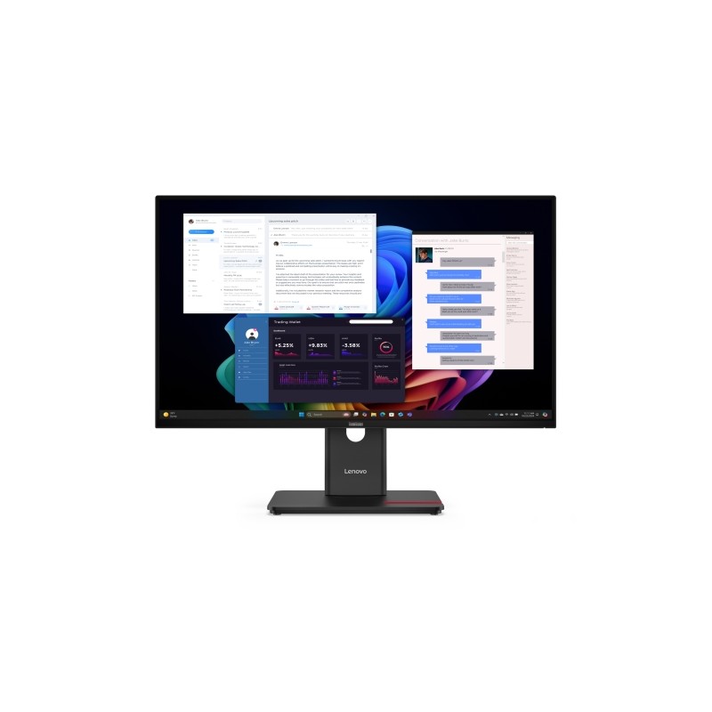 Los monitores de acoplamiento ThinkVision ofrecen un concentrador USB y una solución de acoplamiento de cables que ofrece potencia (hasta 100 W*), datos y pantalla simultáneamente, lo que lo hace conveniente para tu espacio de trabajo digital.