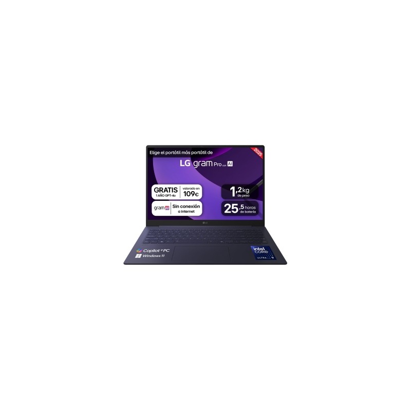 - Con solo 1,2 kg de peso, hasta 25,5 h y 15,7 mm de grosor, el LG gram te acompaña a donde quieras, combinando ligereza y autonomía para una libertad sin límites. - Con el procesador Intel® Core™ Ultra 9, LG gram potencia la AI con Chat On-Device sin conexión a internet, Chat Cloud basado en GPT-4o y Copilot+PC, optimizando rendimiento y eficiencia. - Disfruta de cada detalle con la pantalla IPS WQXGA (2560x1600) de 16" en formato 16:10, con tratamiento antirreflejos y cobertura DCI-P3 99% para ofrecer colores vibrantes y precisos. - Almacenamiento masivo de 1 TB SSD NVMe y 32 GB de RAM LPDDR5x para un rendimiento superior en tareas exigentes como contenido 4K UHD. - Mejora del chasis de magnesio y nano carbono de gran resistencia superando 7 pruebas del estándar militar STD-MIL-810H. - Conectividad rápida y eficiente con 6 puertos: 2 USB 3.2, 2 USB Tipo C con Thunderbolt 4 para carga ultrarrápida, HDMI 2.1 y entrada para auriculares