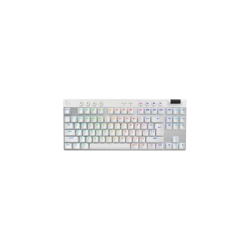 - Juego - RF Wireless + Bluetooth Interruptor mecánico Logitech Tactile - QWERTY Internacional de EE.UU. - Tenkeyless (sin zona numérica) (80 - 87%) - Altura de teclado ajustable - Retroiluminación LED RGB Multicolor - Blanco - 1 pieza(s)