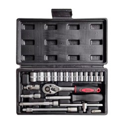 • 13 Vasos 1/4´´: 4,4.5,5,5.5,6,7,8,9,10,11,12,13,14 mm.• 3 Llaves hexagonales: 1.5,2,2.5 mm.• 2 Barras de extensión de 2´´,4´´.• 1 Junta universal 1/4´´.• 1 Barra de extensión flexible de 6´´.• 1 Barra deslizante en T 1/4´´.• 1 Llave chicharra 1/4´´.• 1 Mango giratorio 6´´.• 1 Adaptador de puntas 1/4´´.• 1 Maletín de transporte.