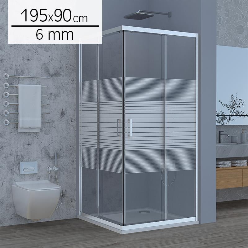 • Mampara cuadrada serigrafiada con marco de aluminio.• Para platos de ducha de 90x90 cm.• Vidrio de 6 mm.• Dos puertas correderas.• Cierre magnético.• Medidas: 1950x900 mm.