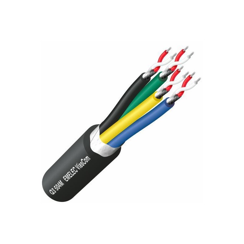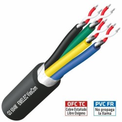 Cable Q3-504M Cable Manguera Multipar Audio 0,20mm² Construcción Cada Par Conductores: Cobre estañado OFC TC Filástica: 25 / 0,10 mm Aislamiento: HDPE Ø 1,10 mm Colores: Blanco-Rojo Pantalla: Espiral OFC TC, 100% cobertura Cubierta: Soft PVC Ø 3,20 mm Colores: Negro, Verde, Amarillo, Azul, Blanco, Rojo, Violeta, Gris, Naranja, Marrón, Rosa, Verde claro, Amarillo claro, Azul claro, Violeta claro, Marrón claro, Negros Num. Componentes globales Separador: Cinta no tejida Cubierta: Soft PVC Ø 9,50 mm Color: Negro Características eléctricas Resistencia 20°C: Conductor: 90 O/km ± 5% Pantalla: 26 O/km ± 5% Aislamiento: mín. 100M O/km ± 5% Capacidad c/c: 92 pF/m Capacidad c/p: 157 pF/m Inductancia 20°C: 30,5 µH/m Tensión máx.: CA 49 V Características físicas No propagador de la llama IEC 60332-1 Temperatura de servicio: -15°C/ +70°C Descripción del producto • Manguera multipar de cables de audio. • Cada par balanceado de 0,20 mm² de sección está protegido por una pantalla helicoidal de alta cobertura en cobre estañado OFC y una cubierta exterior de PVC. • Estos cables de extrema flexibilidad están destinados principalmente a los profesionales y a las aplicaciones móviles. Estudiados para resistir las exigencias mecánicas que se les puedan imponer. • Cada par está identificado por un código de color según tabla. Aplicaciones • Líneas de audio balanceado analógico. • Cableado de racks y equipos de audio. • Instalaciones fijas y móviles.