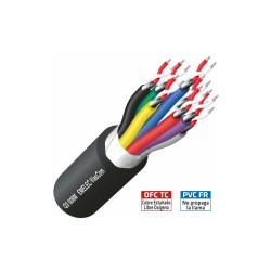 Cable Q3-508M Cable Manguera Multipar Audio 0,20mm² ConstrucciónCada ParConductores: Cobre estañado OFC TCFilástica: 25 / 0,10 mmAislamiento: HDPE Ø 1,10 mmColores: Blanco-RojoPantalla: Espiral OFC TC, 100% coberturaCubierta: Soft PVC Ø 3,20 mmColores: Negro, Verde, Amarillo,Azul, Blanco, Rojo, Violeta,Gris, Naranja, Marrón, Rosa,Verde claro, Amarillo claro,Azul claro, Violeta claro,Marrón claro, Negros Num. Componentes globalesSeparador: Cinta no tejidaCubierta: Soft PVC Ø 9,50 mmColor: Negro Características eléctricasResistencia 20°C:Conductor: 90 O/km ± 5%Pantalla: 26 O/km ± 5%Aislamiento: mín. 100M O/km ± 5%Capacidad c/c: 92 pF/mCapacidad c/p: 157 pF/mInductancia 20°C: 30,5 µH/mTensión máx.: CA 49 V Características físicasNo propagador de la llama IEC 60332-1Temperatura de servicio: -15°C/ +70°C Descripción del producto• Manguera multipar de cables de audio.• Cada par balanceado de 0,20 mm² de sección está protegido por una pantalla helicoidal de alta cobertura en cobre estañado OFC y una cubierta exterior de PVC.• Estos cables de extrema flexibilidad están destinados principalmente a los profesionales y a las aplicaciones móviles. Estudiados para resistir las exigencias mecánicas que se lespuedan imponer.• Cada par está identificado por un código de color según tabla. Aplicaciones• Líneas de audio balanceado analógico.• Cableado de racks y equipos de audio.• Instalaciones fijas y móviles.