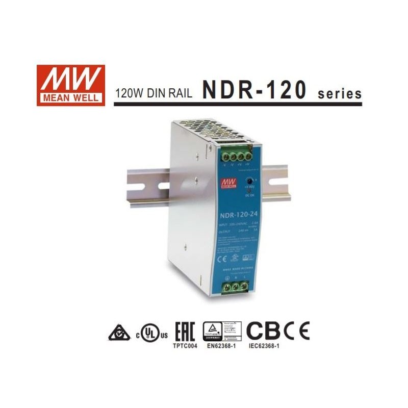 Mean Well Fuente carril DIN 24v 5A serie NDR.Rango de entrada universal 90-264Vca 47-63Hz. Tensión de salida 24Vcc. (Ajustable con potenciómetro 24-28Vcc). Intensidad de salida: 5A. Potencia: 120W.Dimensiones (Ancho x Alto x Fondo): 40 x 125 x 113mm.