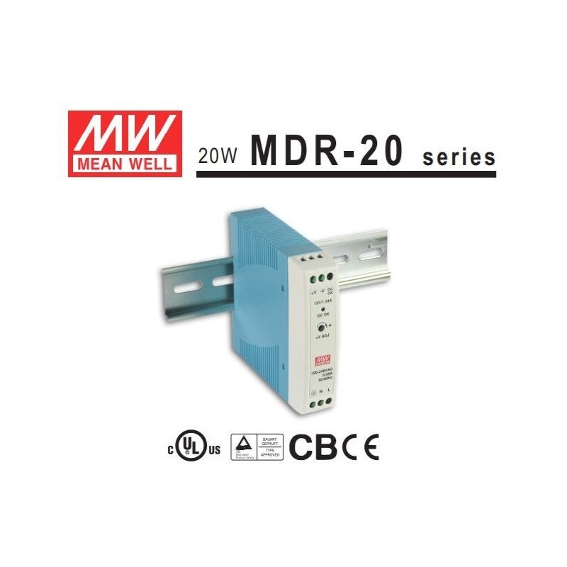 Mean Well. Fuente carril DIN fijo 12v 1.6A .Rango de Entrada universal 85-264Vca 47-63Hz. Tensión de Salida 12Vcc. (Ajustable con potenciómetro 13,8-16,2Vcc). Intensidad de salida: 1,67A Rango de corriente de salida 0-1A según demande la carga. Potencia: 20W.Dimensiones (Ancho x Alto x Fondo): 22.5 x 90 x 100mm.