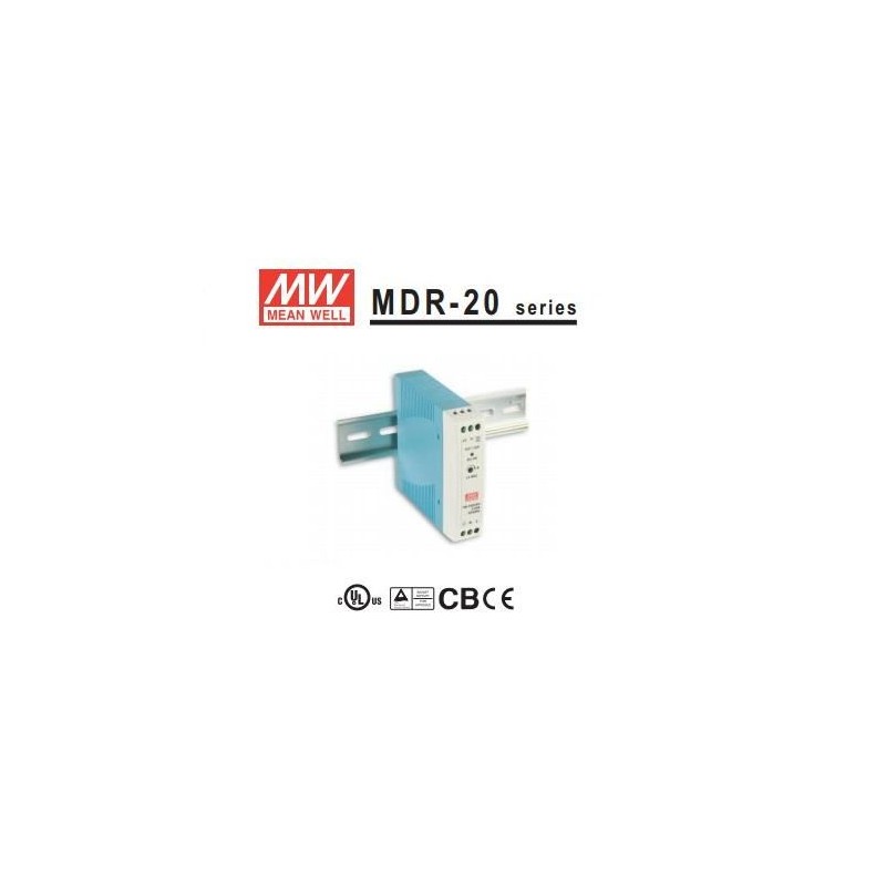 Mean Well. Fuente carril DIN TS35/7.5 ó 15 , led indicador de encendido , 24v 1A serie MDR R&N 150mV Effi.84% Dimensiones (Ancho x Alto x Fondo): 22.5 x 90 x 100mm.