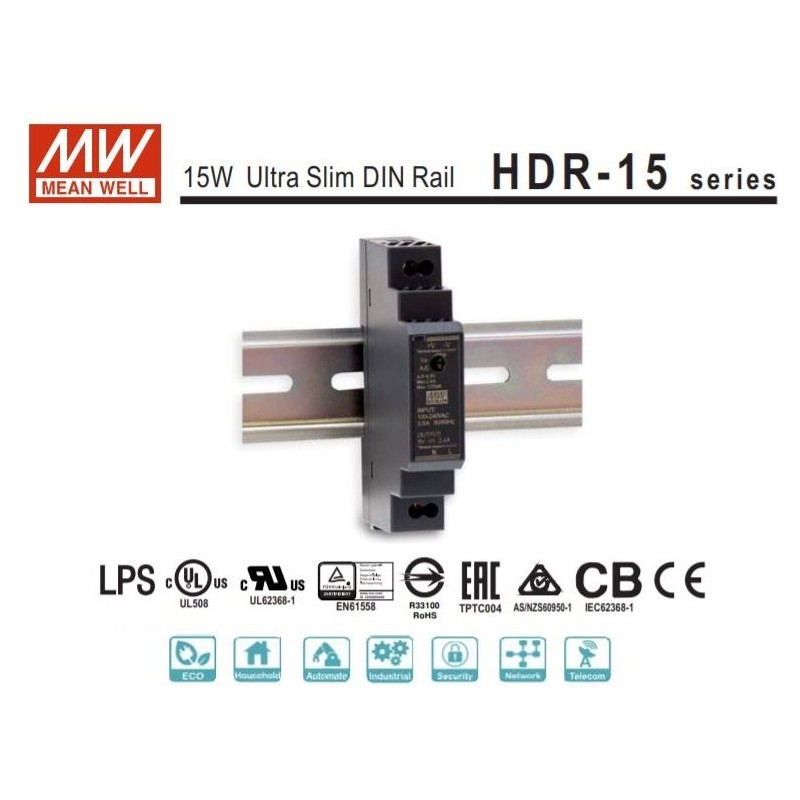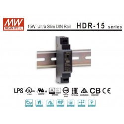 Mean Well. Fuente carril F.Estrecho 12v 1.25A serie HDR.ango de entrada universal 85-264Vca 47-63Hz. Tensión de salida 12Vcc. Ajustable por potenciómetro (10,8-13,8Vcc). Intensidad de salida 1,25A.Potencia: 15W.