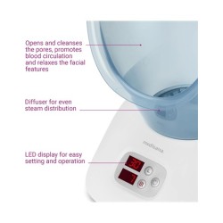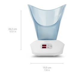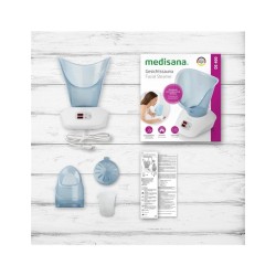 Medisana DS 400 Sauna facial con compartimento de aromas, vaporizador facial, limpiador facial con accesorio para la nariz, función de temporizador, desconexión automática y pantalla LEDColor WhiteMaterial PlásticoMarca MedisanaNombre del modelo DS 400Dimensiones del producto: largo x ancho x alto 21,3 x 22,1 x 24 centímetrosTipo de piel TodasFuente de alimentación BateríaVentajas del producto LimpiadorDuración 1 horaVataje 10Tonificante: El vapor tonificante de la sauna facial aumenta la circulación sanguínea de su piel, abre y limpia los poros y favorece el efecto profundo de sus productos de cuidadoUniforme: El difusor integrado garantiza una distribución uniforme del vapor. También se incluye un vaso medidor y un accesorio para la nariz para una aplicación precisaCompartimento de aromas: Gracias al compartimento de aromas integrado, puede mimar adicionalmente la piel del rostro con aromas relajantesFunción de temporizador: Con la sauna facial, puede ajustar la duración de la función entre 15 y 60 minutos. Con el panel de control se puede ajustar la temperatura de forma variable entre 80 y 95°CSeguridad: La sauna está equipada con una desconexión automática y una protección contra el sobrecalentamiento. Con la desconexión automática, usted mismo puede decidir cuándo debe apagarse la sauna facial.La sauna facial DS 400 abre y limpia los poros, promueve la circulación sanguínea y relaja los rasgos faciales. Gracias al difusor integrado, se distribuye uniformemente el vapor para una aplicación cosmética beneficiosa. La temperatura se puede ajustar de 80-95°C para aromaterapia y 100°C para vapor. El temporizador se puede configurar de 15 a 60 minutos. La sauna facial está equipada con un apagado automático y una protección contra sobrecalentamiento.Medisana es el principal especialista en el mercado de la asistencia sanitaria a domicilio y una marca importante en el campo del masaje. Desde hace 40 años, la empresa alemana está comprometida con la salud de las personas bajo el lema Su salud en buenas manos. Medisana es pionera en la tendencia de la gestión de la salud móvil y ofrece productos orientados al futuro para la vida cotidiana moderna en un mundo cada vez más interconectado. Medisana desarrolla, comercializa y vende productos en las categorías de salud móvil, monitorización de la salud, bienestar, terapia, hogar saludable y cuidado del cuerpo para consumidores preocupados por la salud en todo el mundo. Nuestra gama de productos incluye tensiómetros, básculas de análisis corporal, termómetros para la fiebre y medidores de glucosa en sangre, así como lámparas de luz diurna, despertadores luminosos, inhaladores, humidificadores y un gran número de soportes para asientos de masaje, masajeadores cervicales y cojines de masaje.La sauna facial DS 400 abre y limpia los poros, promueve la circulación sanguínea y relaja los rasgos faciales. Gracias al difusor integrado, se distribuye uniformemente el vapor para una aplicación cosmética beneficiosa. La temperatura se puede ajustar de 80-95°C para aromaterapia y 100°C para vapor. El temporizador se puede configurar de 15 a 60 minutos. La sauna facial está equipada con un apagado automático y una protección contra sobrecalentamiento.