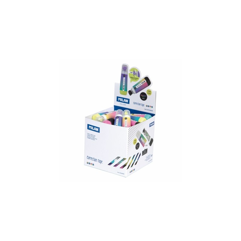 Cinta correctora en seco cilíndrica, serie Sunset. Apta para zurdos gracias a la rotación de 360º de su punta. Rápida, limpia y precisa. Correcciones sobre todo tipo de papel, no deja marcas en fotocopias o fax. 5 mm de ancho x 6 m de largo. Colores surtidos: negro, verde, rosa y amarillo. Serie Sunset: una combinación de colores degradados inspirados en el atardecer, acompañados de detalles en blanco y negro. Recambios de la cinta correctora disponible en formato blíster ref. BWM10467. Características Milan Sunset corrección de películo/cinta 6 m Multicolor 40 pieza(s) Especificaciones Características Color del producto: Multicolor Longitud de cinta: 6 m Ancho de cinta: 5 mm Empaquetado Ancho del paquete: 125 mm Profundidad del paquete: 125 mm Altura del paquete: 125 mm Peso del paquete: 610 g Tipo de embalaje: Caja Contenido del embalaje Cantidad por paquete: 40 pieza(s) Número de paquetes: 1