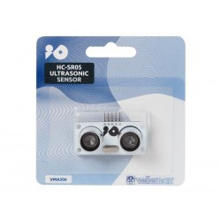 El sensor de distancia por ultrasonidos HC-SR05 ofrece una manera fácil para medir distancias de máx. 4,5mts. Especificaciones: voltaje: 4,5 a 5,5Vdc. Frecuancia: 40KHz. Eesolución de medición: 0,3cm. Angulo de medición: 15º. Corriente: de 10 a 40mA. Conector: 5 polos macho. Distancia de detección: de 2 a 450cm. Dimensiones: 49 x 22 x 15 mm.