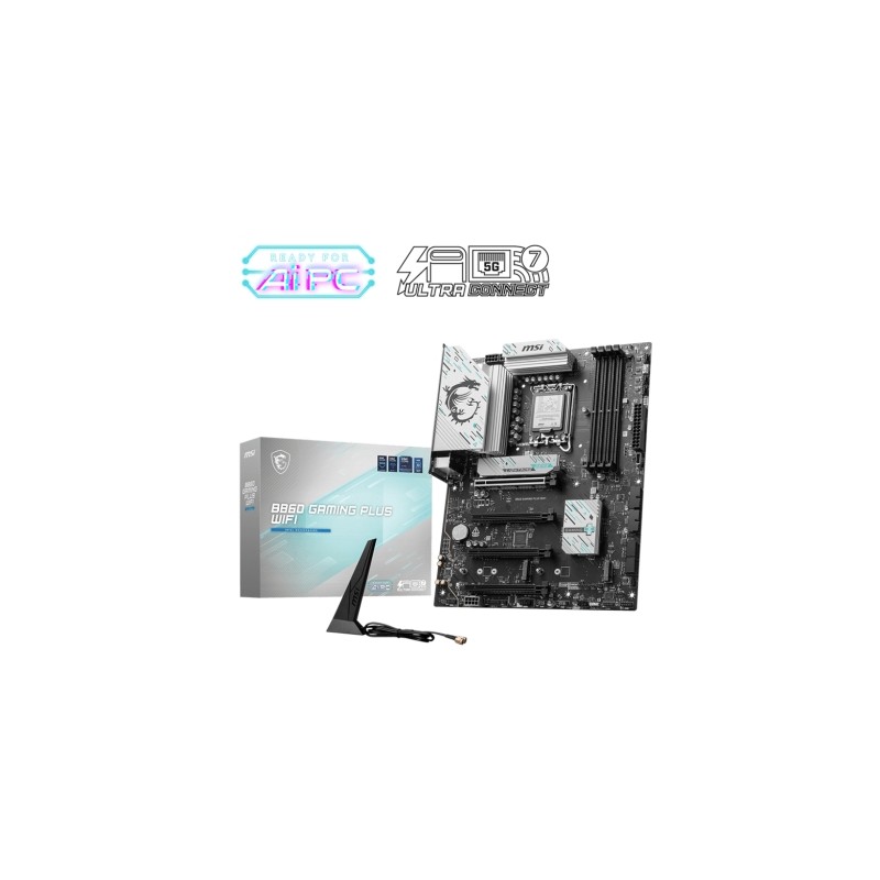 - Intel LGA 1851 (Socket V1) Intel Core Ultra (Series 2) - PC ATX Intel B860 Realtek ALC897 7.1 canales - DDR5-SDRAM 4 DIMM Memoria interna máxima: 256 GB - HDD & SSD M.2, Micro SATA III Compatibilidad con RAID Número de unidades de almacenamiento compatibles: 7 - Tipos de BIOS: UEFI AMI 256 MB/s Versión ACPI: 6.5 - 5 Gigabit Ethernet Wifi Wi-Fi 7 (802.11be) Bluetooth 5.4