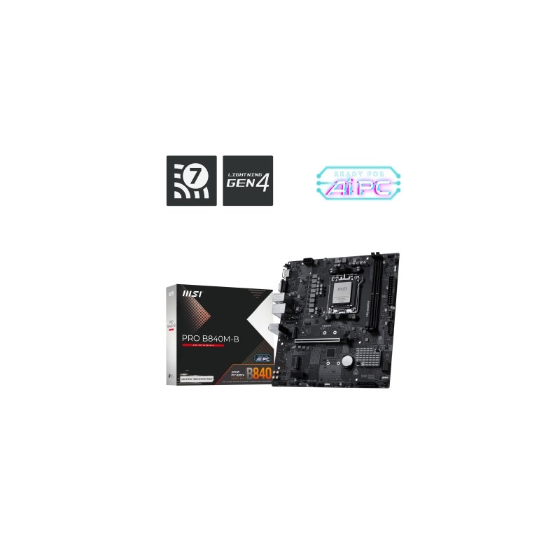 - AMD Zócalo AM5 AMD Ryzen 7000 Series, AMD Ryzen 8000 Series, AMD Ryzen 9000 Series - PC micro ATX AMD B840 Realtek ALC897 7.1 canales - DDR5-SDRAM 2 DIMM Memoria interna máxima: 128 GB - HDD & SSD M.2, Micro SATA III Compatibilidad con RAID Número de unidades de almacenamiento compatibles: 6 - Tipos de BIOS: UEFI AMI 256 MB/s Versión ACPI: 6.5 - 2.5 Gigabit Ethernet