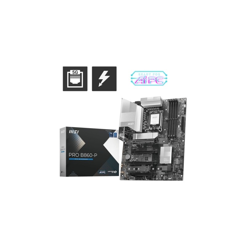 - Intel LGA 1851 (Socket V1) Intel Core Ultra (Series 2) - PC ATX Intel B860 Realtek ALC897 7.1 canales - DDR5-SDRAM 4 DIMM Memoria interna máxima: 256 GB - HDD & SSD M.2, Micro SATA III Compatibilidad con RAID Número de unidades de almacenamiento compatibles: 7 - Tipos de BIOS: UEFI AMI 256 MB/s Versión ACPI: 6.5 - 5 Gigabit Ethernet