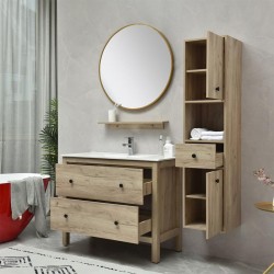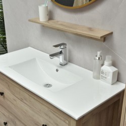 • Repisa de color roble a juego con el resto del mobiliario dónde podrás colocar los productos de higiene más usados a diario.
