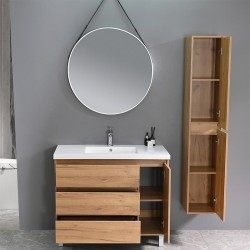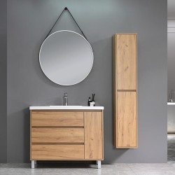 • Conjunto de mueble de baño Serie Mabel.• Este conjunto consta de un mueble + espejo + columna auxiliar.• Tres cajones con sistema de cierre progresivo +  una puerta con espacio de almacenaje interior.• Incluye una columna auxiliar de 160x30x30 cm para acabar con el desorden y mantener todo en su sitio.• Espejo redondo con marco de metal plateado.• Fácil de limpiar.• Medidas del mueble: 100x46x85 (LxAnxAl).• Medidas de la columna: 30x30x160 cm (LxAnxAl).• Medidas del espejo: 80x80 cm.