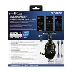Cuffie gaming Nacon 600 PRO HSMarca NaconColor negro and amarilloColocación en las orejas SupraauralesFactor de forma SupraauralesImpedancia 140 OhmioControl de ruido NingunoRespuesta de frecuencia 80 HzConector para auriculares Sin conector jackNombre del modelo RIG600PROHSACIDTecnología de conectividad InalámbricoTecnología de comunicación inalámbrica ‎BluetoothComponentes incluidos ‎Manual de usuarioMaterial ‎PlásticoUsos específicos del producto ‎VideojuegoUsos recomendados para el producto ‎VideojuegosDispositivos compatibles ‎VideoconsolasMétodo de control ‎AplicaciónNúmero de productos ‎1Fabricante ‎NaconModelo ‎RIG600PROHSACIDDimensiones del paquete ‎22 x 21,3 x 10,4 cm, 300 gNúmero de modelo del producto ‎RIG600PROHSACIDInterfaz del hardware ‎BluetoothOtras características ‎Conexión inalámbrica dual (Dual Wireless)Pilas / baterías incluidas ‎NoPilas / baterías necesarias ‎NoTipo de material ‎PlásticoCompatible con tecnología Bluetooth ‎SíPeso del producto ‎300 gCon RIG 600 PRO HS, experimente una calidad de sonido incomparable en sus consolas y PC.Tome el control del chat y el audio de los juegos gracias a la doble conectividad inalámbrica (Dual Wireless) en radio frecuencia de 2.4 GHz y Bluetooth 5.1. Entonces permanecerá conectado a su consola, teléfono y cualquier otro dispositivo móvil a través de la conexión Bluetooth y el adaptador inalámbrico. Los altavoces de 40 mm de alta sensibilidad ofrecen un sonido ultra preciso, impulsado por graves potentes y garantizan un rendimiento acústico equilibrado y sin distorsiones.