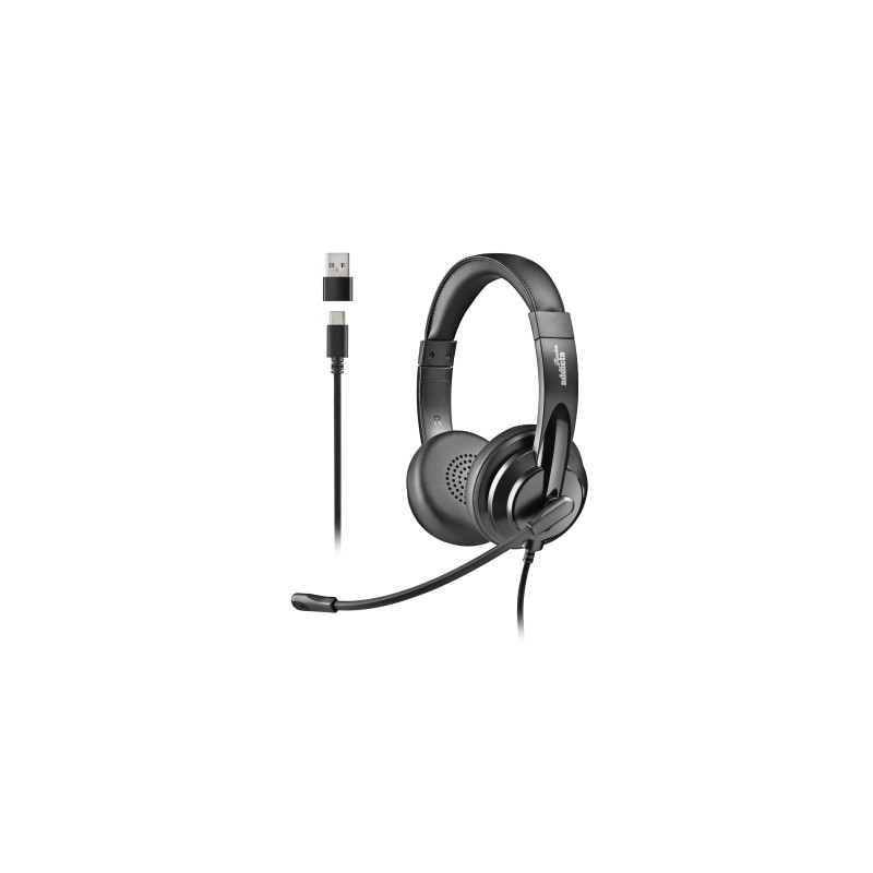 - Auriculares estéreo de alta calidad de sonido con micrófono regulable y flexible. - Accede a cualquier reunión de forma sencilla y rápida gracias a su conexión USB-C, solo tendrás que conectar y estará listo. - Ideal para su uso con ordenadores, tabletas y smartphones - Adaptador USB-A incluido para aumentar su compatibilidad con el mayor número de dispositivos posible. - Compatible con PC, portátiles y videoconsolas con entrada USB y con tabletas y smartphones con entrada USB-C. - Ideal para videollamadas y otras aplicaciones interactivas de audio. - Almohadillas y diadema acolchadas que ofrecen una comodidad óptima para su uso continuado. - Diadema reforzada con metal para una mayor durabilidad. - El control de volumen de fácil acceso se encuentra integrado en el auricular izquierdo. - Tecnología exclusiva de filtrado de ruidos para disfrutar de tu música o llamadas con la máxima claridad. - Longitud del cable de 2 metros para una gran libertad de movimientos. - Instalación "Plug & Play".