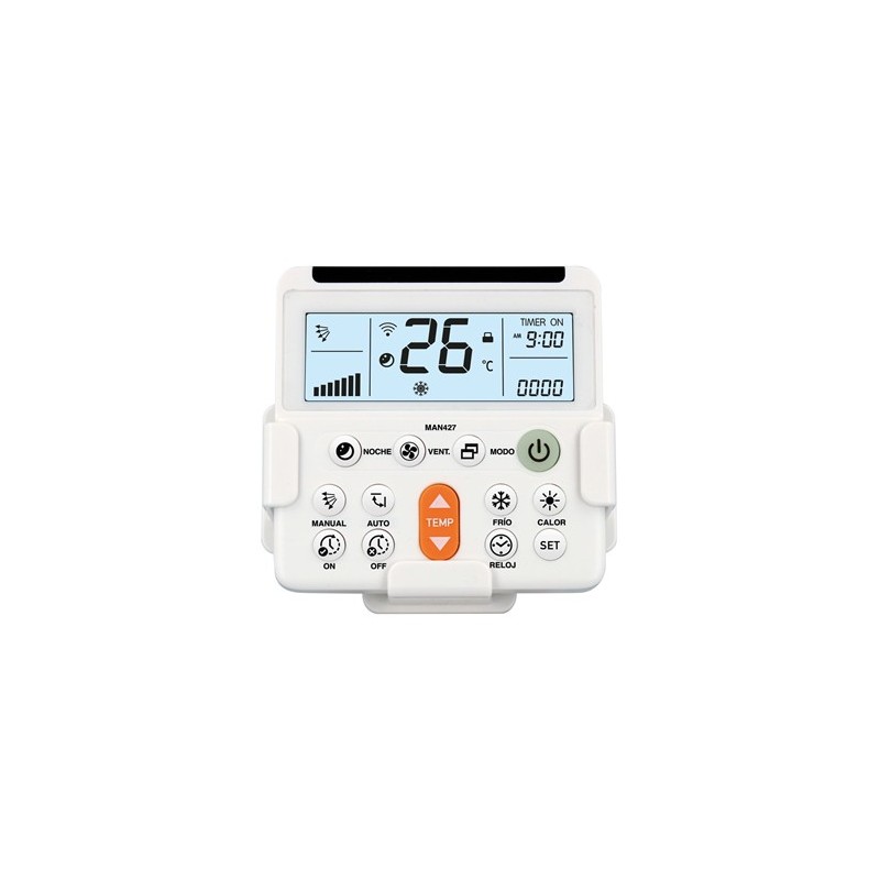 MAN427 Mando universal para aire acondicionadoMarca: NIMOCódigo de barras: 8445577008899Descripción generalMando universal para aire acondicionado. Válido para el 99% de marcas y modelos reemplazando al mando original.Especial para uso en hoteles y apartamentos turísticos, gracias a sus funciones de:Bloqueo de velocidad del ventilador• Puede configurar la velocidad de ventilador para que no sea modificada.Bloqueo de temperatura máxima y mínima• Puede configurar una temperatura máxima y mínima para que solo se pueda seleccionar la temperatura dentro del rango configurado. Está función es muy útil para su uso en locales públicos que deben cumplir la nueva normativa de temperaturas, así como para fomentar el ahorro energético.Bloqueo del teclado• Simplifica y facilita el uso al cliente bloqueando los botones avanzados y dejando sólo los básicos.Características técnicasBatería 2xAAA (R3), no incluidas Bloqueo teclado Bloqueo infantil. Color Blanco Display LCD retroiluminado EMB 1/50/100 Nota Bloqueo de ventilador y temperatura, máxima y mínima Para Spliter, de ventana o consolas de Aire Acondicionado Programación Por marca, código, búsqueda automática o manual Tipo Telemando para Aire Acondicionado compatible