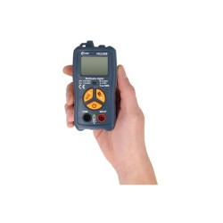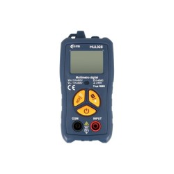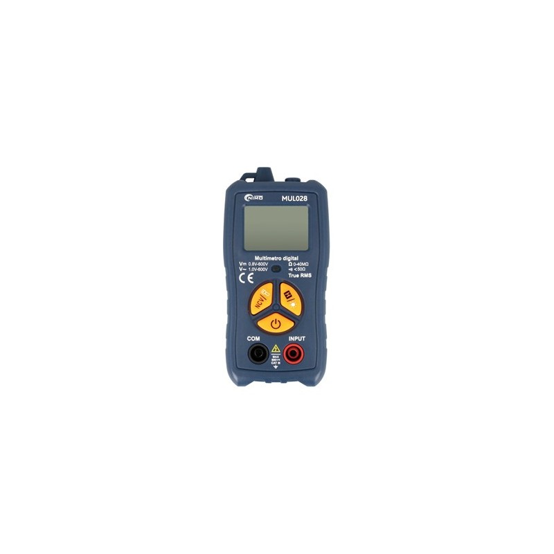 MUL028 Multímetro digital automático de bosillo CAT.III 600VMarca: NIMOCódigo de barras: 8445577010144Descripción generalMultímetro de rango automático true RMS con calificación de seguridad CATIII 600V.Incorpora una pantalla retroiluminada de 3 3/4 dígitos y 3999 cuentas.Su diseño compacto lo convierte en un dispositivo muy portátil.Selección automática de Vcc, Vca, OhmiosFunciones adicionales:• Detección de corriente alterna sin contacto (NCV)• Función de linterna para iluminar áreas con iluminación escasa• Mantenimiento de datos.• Indicador sonoro de continuidad.Características técnicasAccesorios incluidos Puntas de prueba y muñequera Alimentación AAA x2 (incluidas) Autoapagado Si Autoapagado: Si Categoría Seguridad CAT.III 600V Corriente CA No mide Corriente CA: No mide Corriente CC No mide Corriente CC: No mide Detalle Detección NCV de tensión sin contacto EMB 1/40 Indicador batería baja Si Indicador batería baja: Si Luz trasera Si, display retroiluminado Luz trasera: Si, display retroiluminado Mantenimiento de datos Si Mantenimiento de datos: Si Nota Función linterna Resistencia Autorrango 0-40MOhm Resistencia: Autorrango 0-40MOhm Seguridad CAT. III 600V Tamaño 120.0x59.0x28.0mm Voltaje CA True RMS, autorrango 1-600V Voltaje CA: True RMS, autorrango 1-600V Voltaje CC Autorrango 0.8-600V Voltaje CC: Autorrango 0.8-600VZumbador de continuidad Si