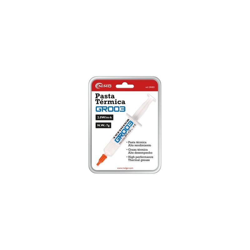 GR003 Pasta de unión térmica sin siliconaMarca: NIMOCódigo de barras: 8445577000602Características técnicasAplicación Para componentes electrónicos Color Blanco Detalle Dieléctrico 2.0W/m-k, Rango de temperatura -50 a +200ºC Producto Pasta de unión térmica, Jeringa 7gr.