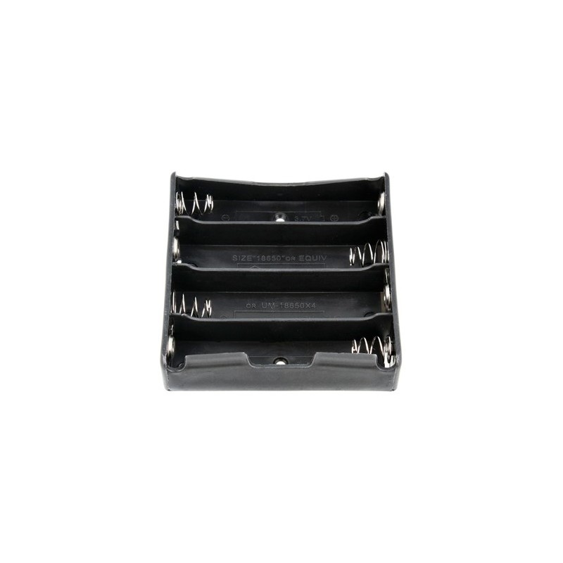 POR037 Portapilas para batería de litio 18650 x 4 montaje C.I.Marca: NIMOCódigo de barras: 8445577013060Características técnicasAplicación Batería 18650 x 4 en serie Para Montaje en circuito impreso Tamaño 75,7x80,0x19,7mm