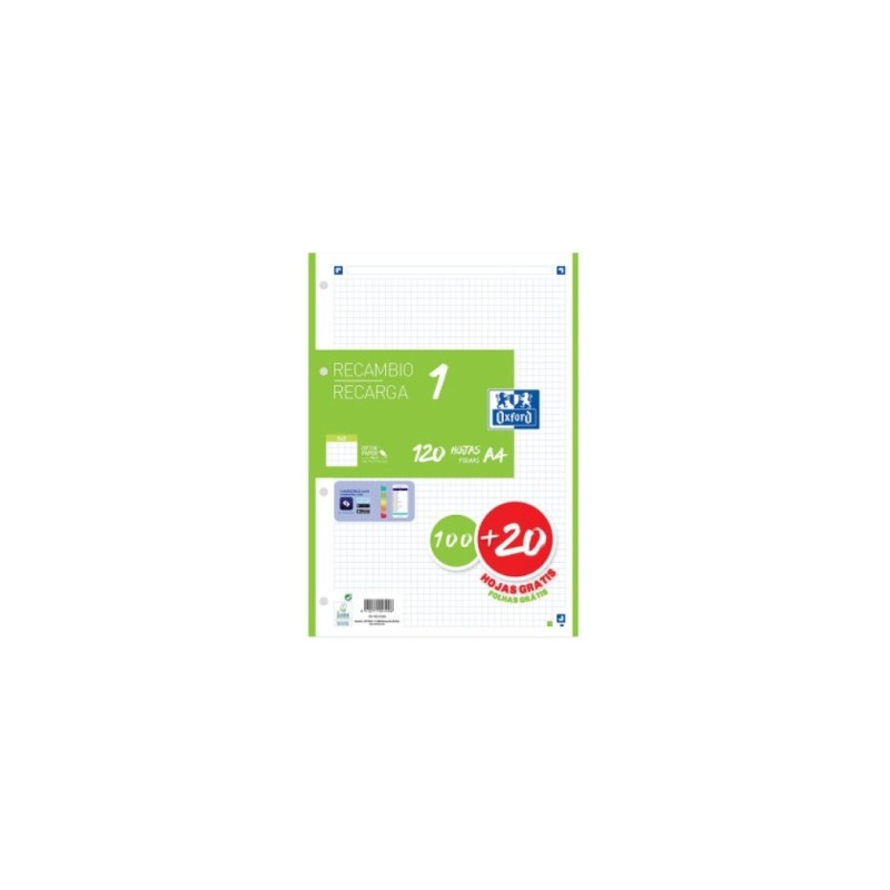 Recambio OXFORD retractilado en paquete de 120 Hojas (100+20) con 1 color de banda y 4 taladros de archivo para poder guardar las hojas en un archivador o carpeta de anillas. Ideal para quienes prefieren hojas sueltas y llevar sólo las que necesiten. Compatible con la app gratuita SCRIBZEE que permite organizar, consultar, compartir y acceder a tus notas en cualquier lugar desde tu Smartphone, tablet o PC. Características - Promoción 100 + 20 hojas gratis - Papel OptikPaper: un papel exclusivo de Oxford único por su opacidad, lisura y satinado. La tinta no traspasa de un lado a otro ni se dispersa, resistente a la presión del lápiz y al borrado. Permite la escritura en ambas caras de la hoja - 1 banda de color ideal para la clasificación por color de las asignaturas - Paquete de hojas sueltas con taladros. Archívalas fácilmente y transporta sólo las hojas que necesites - EU Ecolabel: certificación que garantiza la minimización de la huella ambiental en cada paso del ciclo de vida del producto - Compatible con la aplicación gratuita SCRIBZEE que permite escanear tus notas manuscritas para poder tenerlas en el móvil, tablet u ordenador y compartirlas, organizarlas, o consultarlas cuando y dónde quieras Especificaciones Características Formato: 210 x 297 mm (A4) Papel rayado: Si Tipo de papel rayado: Papel cuadriculado Color de medio: Verde Contenido del embalaje Hojas de medios por paquete: 120 hojas