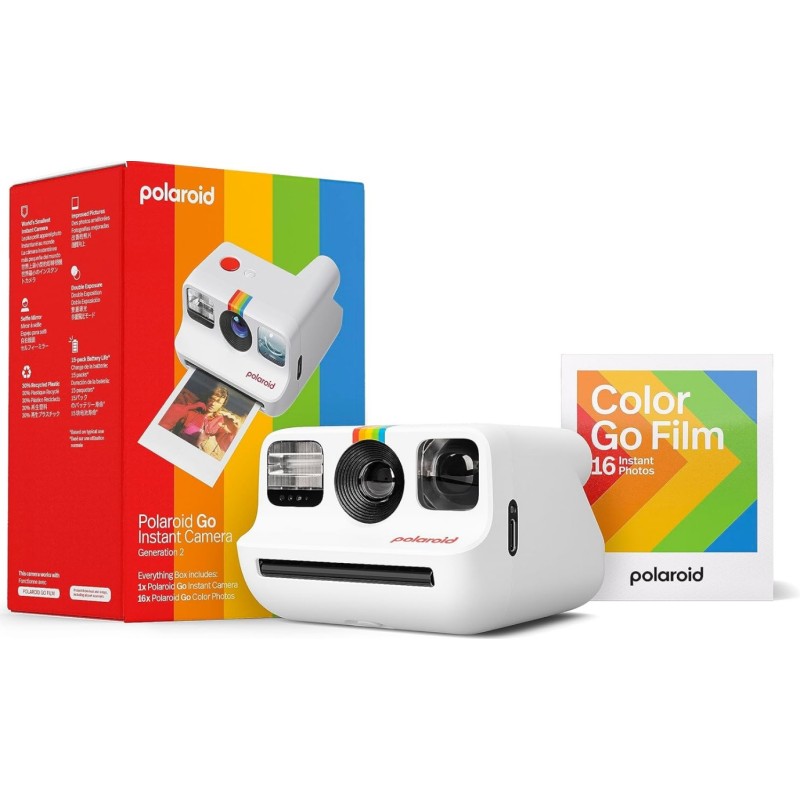 PACK EVERYTHING BOX: CAMARA POLAROID GO GEN.2 BLANCA + GO FILM COLOR 16 PHOTOS / 006282 El paquete incluye cámara Polaroid GO y un paquete doble de película a color GO, 16 fotos. Crea grandes, más pequeños: portátil, portátil y para llevar a cualquier lugar. La cámara Polaroid Go es tu nuevo mini socio en creatividad. Ahora con un 30% de plástico reciclado. Doble exposición, mitad del tamaño: añade otra capa a tu visión creativa con la función de doble exposición fácil de usar. Temporizador automático y listo para selfie: encuentra tu luz con el espejo reflectante para selfies y elige tu postura con mucho tiempo, gracias al temporizador automático. Nuevo formato de película: la cámara Polaroid Go solo toma película de formato Polaroid Go. Es la misma magia de Polaroid que conoces y amas, solo que más pequeña. FOTOS MÁS NÍTIDAS, MÁS LUMINOSAS, MÁS BONITAS. La calidad de imagen de la Polaroid GO Generation 2 es mejor que nunca gracias al gran rango de apertura, el sensor de luz preciso y los ajustes para una exposición impecable. DISPARA CON LA PELÍCULA DE BOLSILLO POLAROID GO. Captura los momentos más grandes de tu vida con la película Polaroid más pequeña. 53.9 mm x 66.66 mm ESPEJO PARA SELFIES INTEGRADO. Mírate y di "¡patata!" en el visor reflectante de la Polaroid Go, también conocido como "espejo para selfies". BATERÍA RECARGABLE, AUTONOMÍA PARA 15 CARGAS. Batería integrada recargable con USB-C: dispara, dispara y vuelve a disparar.