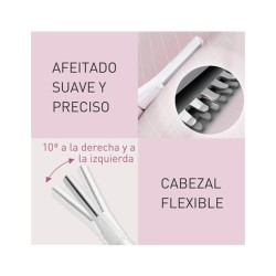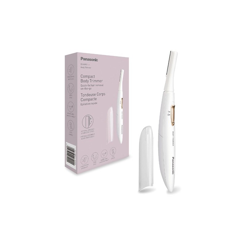 Panasonic ES-WR51 Recortadora Corporal Compacta, Depiladora para Mujeres, Afeitadora para Mujeres, En Seco, Funciona con Pilas (se requiere 1 AAA), Tapa Protectora, Cepillo De Limpieza, Color BlancoMarca PanasonicUsos recomendados para el producto Pierna, axila, línea de bikini, púbicoFunción especial ImpermeableFuente de alimentación BateríaNombre del modelo ES-WR51Componentes incluidos Cepillo de limpieza, Tapa protectoraPeso del producto 20 GramosColor BlancoMaterial de la cuchilla Acero inoxidableTipo de cabeza RotaryAFEITADO SUAVE Y EFICIENTE: La cuchilla fina de acero inoxidable con borde redondeado afeita al ras pero es suave con la piel, proporcionando un acabado impecable, cómodo y suave en todo momentoCABEZAL FLEXIBLE: Experimente un afeitado al ras y sin esfuerzo gracias al cabezal flexible que se adapta perfectamente a los contornos de la piel, reduciendo las zonas que se pasan por alto y minimizando la irritación de la pielDEPILACIÓN DE CUERPO COMPLETO: Consiga una piel suave en todo el cuerpo con esta depiladora portátil diseñada para abordar incluso las zonas difíciles de afeitar, como la línea del bikini y la nucaAFEITADO EN SECO SIN JABÓN: Lo que le permite realizar retoques y afeitados rápidos siempre que lo necesite, ya sea antes de salir o cuando esté de viajeCOMPACTA Y PORTÁTIL: Con un peso de tan solo 20 g (sin batería), esta afeitadora delgada y liviana para mujeres cabe fácilmente en una bolsa, funciona con 1 batería AAA (no incluida) y no necesita cargador, ideal para viajesAdvertencia de seguridad: Este producto es un afeitador eléctrico con una cabeza rotativa que se utiliza en áreas sensibles del cuerpo. Es operado por batería y puede ser utilizado cerca del agua para limpieza. Aunque se menciona afeitado en seco, no se especifica que sea resistente al agua. Por lo tanto, es importante tener en cuenta el riesgo de cortes y irritación de la piel, así como la importancia de una limpieza y cuidado adecuados para prevenir el crecimiento bacteriano. Además, se debe precaver sobre el uso del afeitador cerca del agua o durante la carga.Depilación rápida fuera de casaElegante y agradable con la piel, esta afeitadora compacta ofrece un acabado suave para el cuerpo y la línea del bikini. Ideal para retoques rápidos y suaves mientras viajas: un imprescindible en tu neceser.Afeitado suave y eficazEsta hoja redondeada es suave con la piel y ofrece un acabado apurado con su borde fino de 0,12 mm que corta el pelo desde la raíz. Resulta rentable y duradera, y está hecha de acero inoxidable resistente.Cabezal basculante flexibleSe mueve y se adhiere a la piel, ajustándose a sus contornos y asegurando un afeitado apurado sin dejar zonas atrás. Esto permite afeitarse sin presionar la piel.Afeitado en seco sin jabónPermite un afeitado en seco sin necesidad de jabón ni loción. Al guardarlo en la bolsa, podrás depilarte fácilmente cuando lo necesites, pues garantiza una experiencia cómoda y sin complicaciones.Perfecta para usar fuera de casaCon un peso de solo 20 g, esta herramienta compacta, delgada y ligera se puede transportar fácilmente en una bolsa con la tapa protectora. Como funciona con una única pila, no es necesario llevar cargador.