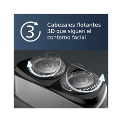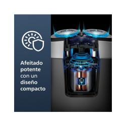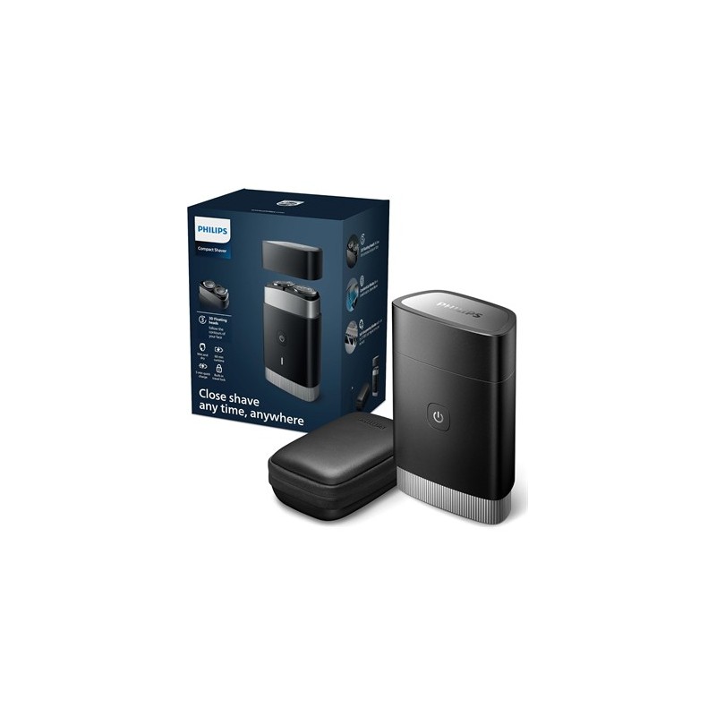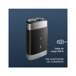 Afeitadora portátil Philips, afeitadora eléctrica en seco y húmedo para llevar, sistema de cuchillas ComfortCut, cabezales flotantes 3D, diseño compacto, batería potente, modelo PQ888/06Marca PhilipsUsos recomendados para el producto CaraFunción especial Cabezales flotantes 3DFuente de alimentación BateríaNombre del modelo 885288806010Color BlackMaterial de la cuchilla Acero inoxidableTipo de cabeza PivotingDescripción de la pila RecargableNúmero de cuchillas 2Afeitado potente con diseño compacto: 18 cuchillas ComfortCut autoafilables de acero inoxidable cortan el vello justo por encima de la piel con 37.000 cortes por minuto para un acabado suave y uniforme en todo momento.Sigue el contorno de tu cabeza con los cabezales flotantes 3D: los cabezales de la afeitadora flotan en 3 direcciones diferentes, siguiendo el contorno de tu rostro para un afeitado limpio, incluso en las zonas de difícil accesoBatería potente: viaja tranquilo con 2 meses de afeitado con una sola carga¹, cuando tengas prisa, enchufa la afeitadora durante 5 minutos y obtendrás potencia suficiente para 1 afeitado completoAfeitadora totalmente lavable y resistente al agua para un cómodo afeitado en seco o un refrescante afeitado en húmedo: adapta tu rutina de afeitado a tus necesidades y aféitate con gel o espuma, incluso bajo la duchaFácil de limpiar con una cámara incorporada que atrapa el pelo cortado para que no se ensucie, fácil de guardar y proteger con un práctico estuche de viaje de lujo, un bloqueo de viaje incorporado evita que la afeitadora se enciendaEl set incluye: 1 afeitadora portátil Philips Norelco, 1 capuchón, 1 estuche de viaje de lujo, 1 cable de carga USB-A, adaptador de corriente no incluido