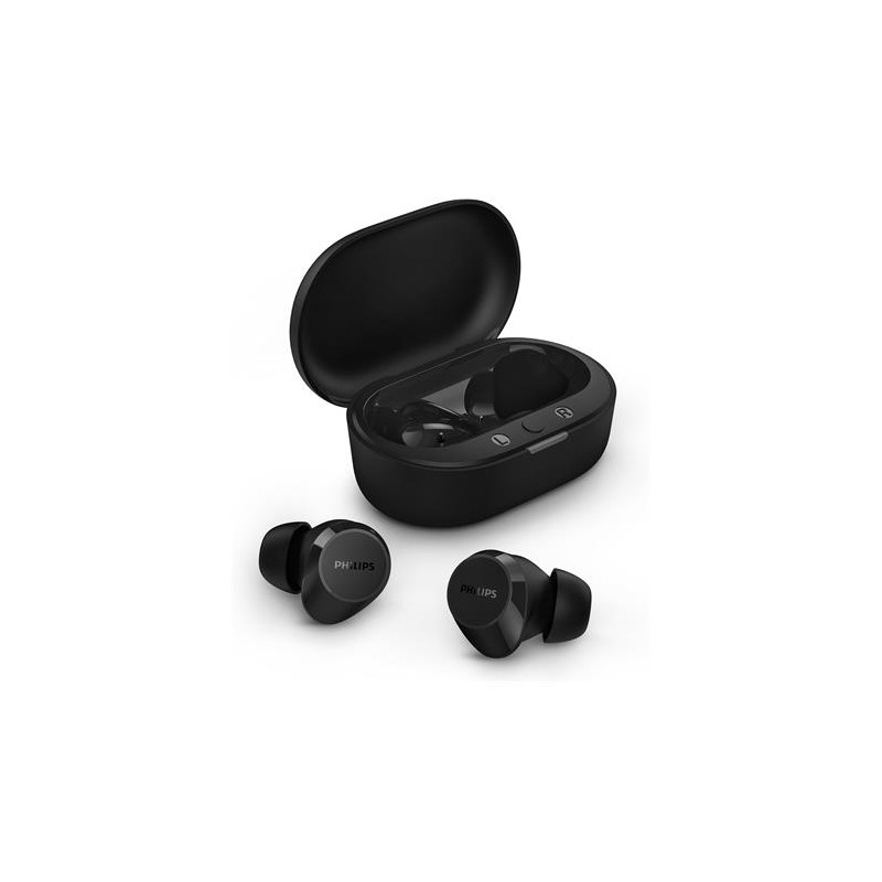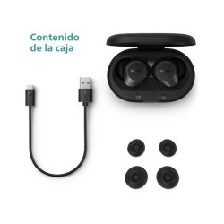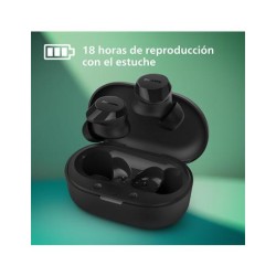 Philips TAT1209BK Auriculares True Wireless con Bluetooth - Auriculares pequeños, Gran Valor, un Sonido Natural con Graves dinámicos, Llamadas nítidas y Estuche de Carga tamaño Bolsillo - NegroMarca Philips AudioNombre del modelo Philips True Wireless T1209, NegroColor NegroFactor de forma IntrauralesTecnología de conectividad Bluetooth, InalámbricoTecnología de comunicación inalámbrica BluetoothFunción especial Ligero, Micrófono incluido, Control táctil, Carga rápida, Resistente al aguaComponentes incluidos Almohadillas: 3 pares (S/M/L), Estuche de carga, Guía de inicio rápido, TAT1209BK Auriculares realmente inalámbricos, Cable de carga: Cable USB-C, 200 mmAlmohadillas: 3 pares (S/M/L), Estuche de carga, Guía de inicio rápido, TAT1209BK Auriculares realmente inalámbricos, Cable de carga: Cable USB-C, 200 mmRango de edad (descripción) AdultoMaterial PlásticoLlamadas nítidas: su voz se escuchará con total claridad durante sus llamadas. Un micrófono específico recoge el sonido de su voz, mientras que un algoritmo de reducción del ruido silencia parte del ruido de fondo procedente del mundo que le rodea.Estuche de carga de tamaño bolsillo: el fino estuche de carga cabe perfectamente en un bolsillo, lo que le permitirá proteger sus auriculares y cargarlos mientras no los use. El modo Mono le permitirá usar uno de los auriculares mientras el otro se carga.Resistente a salpicaduras y sudor, protección IPX4. No se preocupe por el tiempo: IPX4 significa que resisten a las salpicaduras, por lo que puede llover un poco. ¿Quiere usarlos entrenando o en un día muy caluroso? Tampoco importa un poco de sudor.18 horas de reproducción con el estuche: 6 horas con carga completa, y 12 horas adicionales con el estuche. Recárguelos en el estuche completamente en 2 horas. ¿Necesita una carga rápida? En 15 minutos tendrá una hora extra. El estuche se carga por USB.Ajuste cómodo y controles táctiles: almohadillas intercambiables para un ajuste perfecto, adaptación suave y segura a su oído. Controles táctiles para mayor simplicidad. Refuerzo dinámico de graves, control de reproducción o contestación de llamadas.Usos específicos del producto: Viaje, Entretenimiento, BusinessTiempo de carga: 2 HorasColocación en las orejas: IntrauralesImpedancia: 16 OhmioSensibilidad: 97 dBFunción de cable: DesmontableRespuesta de frecuencia: 20000 HzNivel de resistencia al agua: Resistente al aguaTipo de paquete: Embalaje estándarFabricante: TP VisionModelo: TAT1209BK/00Dimensiones del producto: 3,59 x 5,8 x 2,52 cm, 30 gPilas: 3 Polímero de litio necesaria(s), incluida(s)Número de modelo del producto: TAT1209BK/00Número de producto: TAT1209BK/00Otras características: Ligero, Micrófono incluido, Control táctil, Carga rápida, Resistente al aguaNúmero de productos: 1Duración media de la batería: 18 HorasPilas / baterías incluidas: SíPilas / baterías necesarias: SíComposición de la pila de la batería: Polímero de LitioCaracterísticas del cable: DesmontableTipo de material: PlásticoAlcance máximo: 10 MetrosFactor de forma: in-earIncluye batería recargable: SíPeso del producto: 30 g