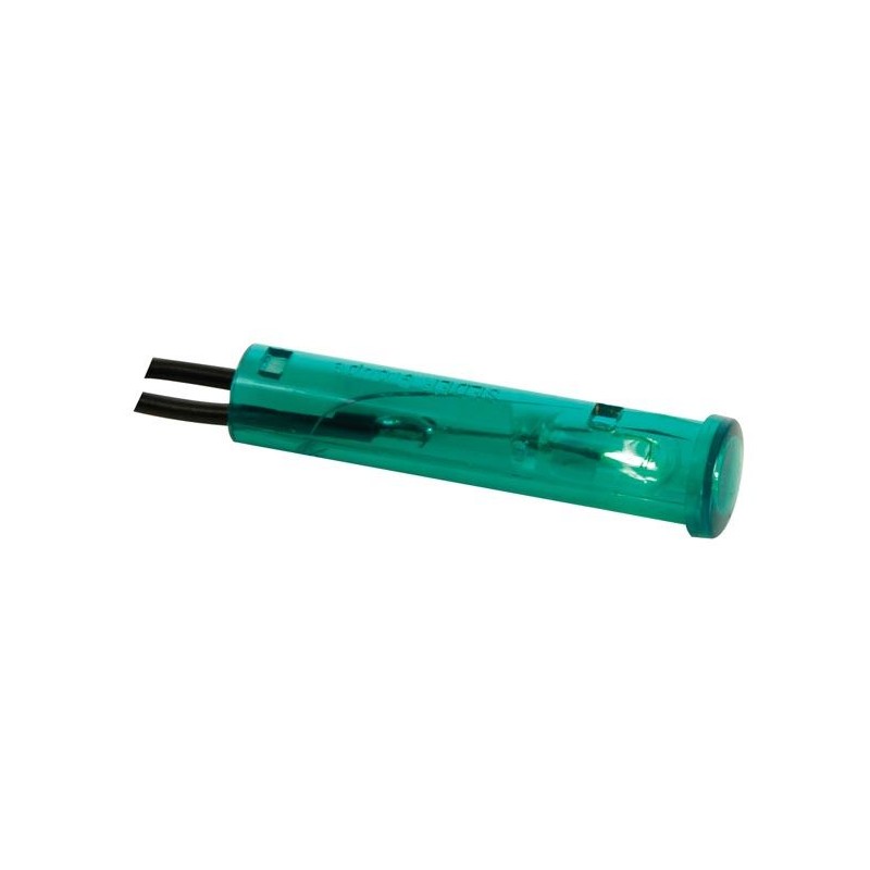 Piloto de montaje a presión verde. Voltaje: 12Vac y 12Vdc. Conexión: cable PVC 2x0,5mmx200mm. Diámetro de taladro: 5,5mm. Medidas: 24x5mm, diámetro del capuchón: 7mm.