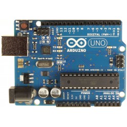 La Arduino Uno es una placa con microcontrolador basada en el ATmega328. Contiene todo lo necesario para el funcionamiento del microcontrolador. Para empezar a utilizar la placa sólo es necesario conectarla a un ordenador con un cable USB o alimentarla con un adaptador AC/DC o una batería. La ARDUINO UNO difiere de anteriores versiones en que no utiliza el chip convertidor serie a USB FTDI, en lugar de ello incorpora un ATmega16U2 programado como convertidor serie a USB. Características - Entradas/salidas digitales: 14 (6 de estas se pueden utilizar para salidas PWM). Entradas analógicas: 6. Incluye oscilador de cristal de 16 MHz, conexión USB, clavija hembra tipo Jack, conector ICSP, botón de reinicialización. Especificaciones: Alimentación: 6-20V máx. (adaptador no incl.). Microcontrolador: ATmega328. Pins E/S digitales: 14 (6 de estas se pueden utilizar para salidas PWM). Corriente DC por pin E/S: 40mA. Corriente DC para el pin 3.3V: 50mA. Pins de entrada analógicos: 6. Memoria flash: 32Kb. (ATmega328), el bootloader usa 0,5Kb. SRAM: 2Kb (ATmega328). EEPROM: 1Kb (ATmega328). Frecuencia de reloj: 16MHz.