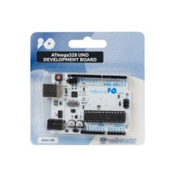 La VMA100 (compatible con Arduino® Uno) es una placa basada en el microcontrolador ATmega328. Tiene 14 pines de entrada/salida digitales (de los cuales 6 pueden ser utilizados como salidas PWM), 6 entradas analógicas, un resonador cerámico, una conexión USB, un conector de alimentación, un conector ICSP y un botón de reinicio. Incluye todo lo necesario para hacer funcionar el microcontrolador. Conéctela al ordenador con el cable USB o aliméntela con un adaptador o una batería para empezar.