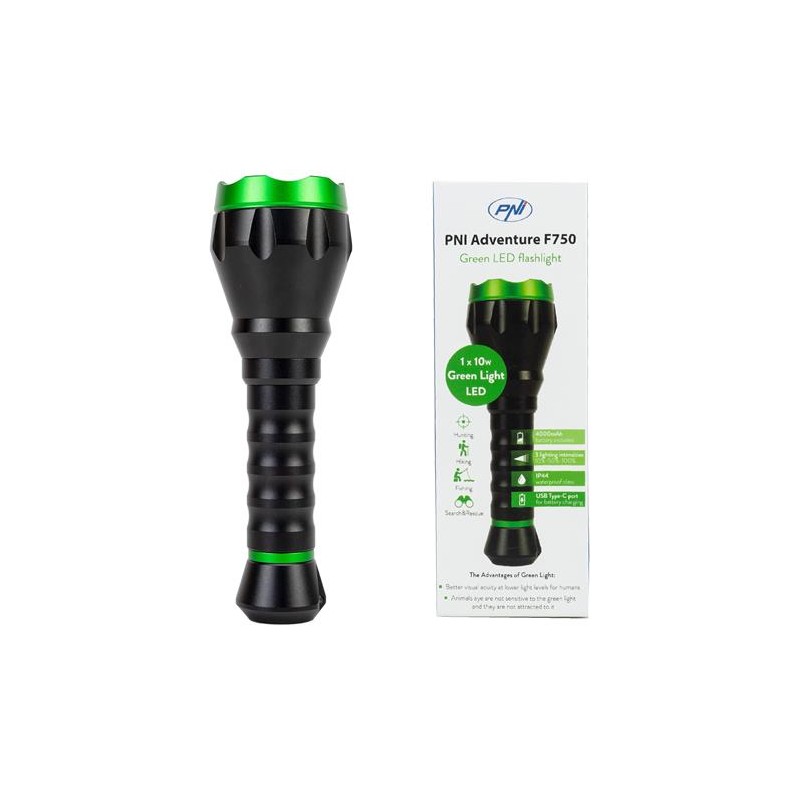 PNI Linterna de aluminio Adventure F750 Green Light, LED 10W, 500 lm, hasta 850 m, IP44, batería de 4000 mAh incluida, carga a través de USB Tipo-C, luz verde perfecta para la cazaFunción especial Ajustable, potencia LEDColor VerdeFuente de alimentación BateríaTipo de fuente de iluminación LEDMaterial AluminioComponentes incluidos Batería, Accesorio, Linterna, Cable de cargaDimensiones del producto 19Prof. x 5,5Ancho x 5,5Alto centímetrosDistancia de la trayectoria de la luz 850 MetrosComposición de celdas de batería Litio IonPeso del producto 381 GramosDiseño especial para la caza y la observación de vida silvestre por la nocheLos ojos de los animales no son sensibles a la luz verde como los ojos humanos, por lo que no se asustarán con esta linterna LED de luz verde. Nuestros ojos, por otro lado, son más receptivos a la luz verde que a la luz blanca, y obtenemos una mejor agudeza visual en niveles de luz más bajos.Animales como venados, cerdos, coyotes, zorros, incluidos peces, serpientes y reptiles no se asustan con una linterna verde. Además, los insectos no se sienten atraídos por la luz verde. Por lo tanto, podrá seguir fácilmente a la presa en la oscuridad y podrá observar la vida silvestre de manera segura.También puede utilizar esta linterna con fines militares. La luz verde permite la diferenciación entre colores y los mapas son más fáciles de leer.LED Osram verde 10WLa linterna PNI Adventure F750 con LED verde Osram, con una distancia de iluminación especial de hasta 850 metros y una potencia de 10W y 500 lúmenes puede convertirse en un accesorio indispensable en otras situaciones además de la caza como senderismo, pesca, seguridad o búsqueda y rescate.Linterna de luz verde PNI Adventure F750Batería de 4000 mAh incluidaLa linterna LED verde PNI Adventure F750 funciona con una batería de iones de litio tipo 21700 con una capacidad de 4000 mAh. La batería se carga mediante un cable USB tipo C. Tanto la batería como el cable USB están incluidos en el paquete.Linterna de luz verde de alto rendimientoEl corazón de cada linterna es su fuente de luz. La iluminancia de la fuente de luz (lúmenes), su espectro (color de la luz) y el radio de iluminación determinarán el rendimiento de la linterna.El PNI Adventure F750 cumple con todas las condiciones para garantizar el máximo rendimiento: máximo 500 lúmenes, luz verde con intensidad ajustable (100%, 50%, 10% y estroboscópica), rango de iluminación de hasta 850 metros y batería incluida de 4000 mAh que garantiza operación por hasta 9 horas.