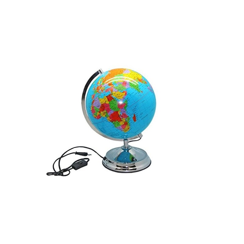Características Especificaciones Esfera geográfica con meridiano, fabricada en plástico de alta resistencia con una base metálica muy robusta y cartografía físico política. Con luz Medidas globo: 25 x 35 x 23 cm