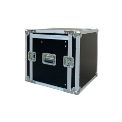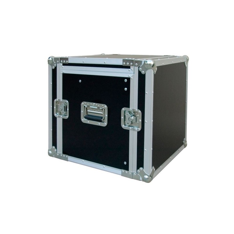 Rack de madera con perfiles metalicos. 10 unidades de altura en parte frontal, superior 8 unidades. Apertura de puertas frontal, trasera y superior. Puertas con protecciones de espuma. Cantoneras antigolpes. Asas laterales de transporte. Profundidad de rack 470mm.