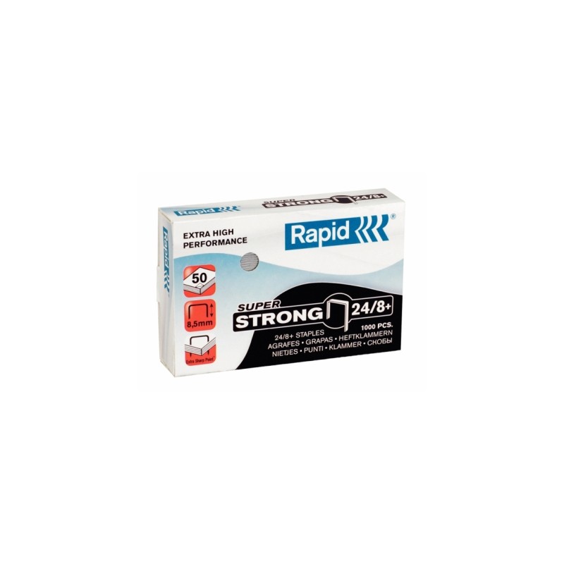 Grapas de alambre Super Strong con penetración de calidad de hasta 50 hojas. Características - Para grapar hasta 50 hojas (80 g/m²) - Cada caja contiene 1.000 grapas - Símbolos rojos para reforzar la segmentación: SUPER STRONG - Patilla de 8,5 mm de largo - Alambre superreforzado galvanizado para el mejor rendimiento - Bordes afilados para mejor penetración Especificaciones Características Capacidad: 1000 grapas Tipo de grapa: 24/8+ Peso y dimensiones Peso: 60 g Otras características Dimensiones (Ancho x Profundidad x Altura): 48 x 73 x 16 mm