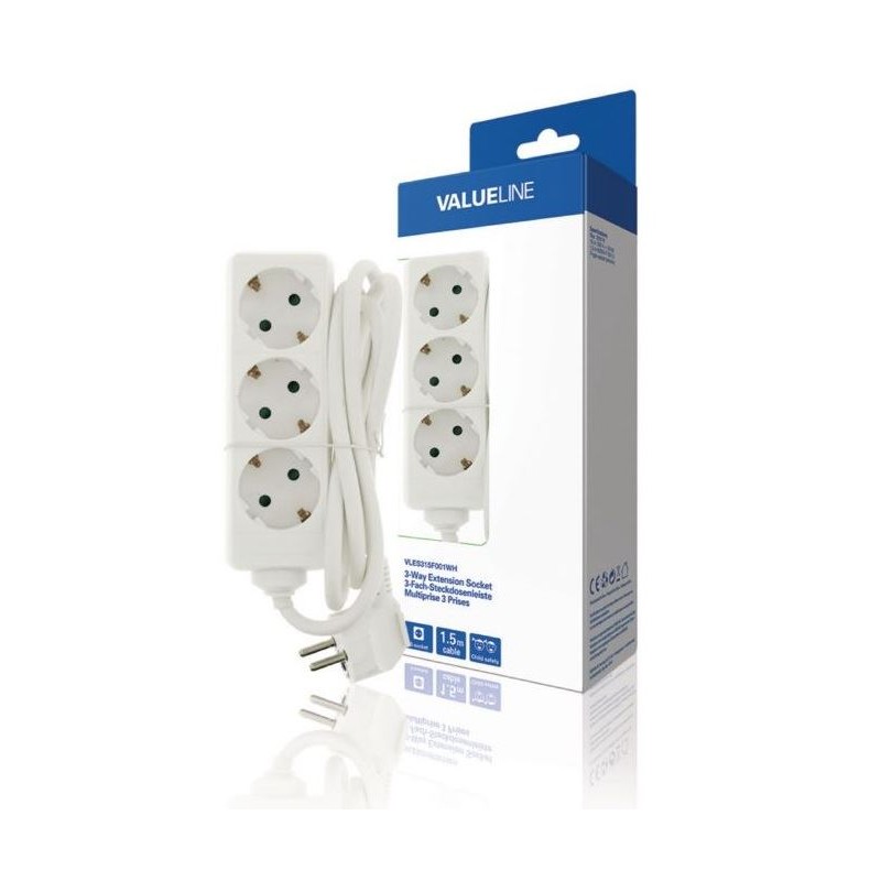 Regleta 3 tomas cable 1,5m blanco.Regleta con cierres de seguridad para niños que permite dividir una toma de pared en tres puntos de alimentación. Está equipada con un cable de gran longitud para conectar dispositivos eléctricos en cualquier lugar del hogar o de la oficina.
