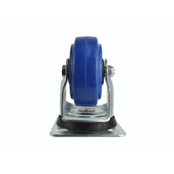 Rueda 80mm giratoria sin freno. Núcleo de poliamida recubierto con banda de caucho elástico. Rodamiento de bolas para el giro. Características Diámetro rueda: 80 mm Carga máxima: 110 Kg Banda caucho elástico Norma: EN 12532 Diámetro 80mm Freno NO Color Azul Banda de rodadura 34mm Acabado Liso Altura 110mm Carga 110Kg Diámetro de giro 160mm Norma EN 12532 / EN 12527 Peso 0.79Kg Diámetro anclaje 8mm Temperatura funcionamiento +75ºC a -25ºC Material Núcleo de poliamida con banda de caucho elástico Dureza 70º Shore Superficie de contacto Placa 110 x 85mm