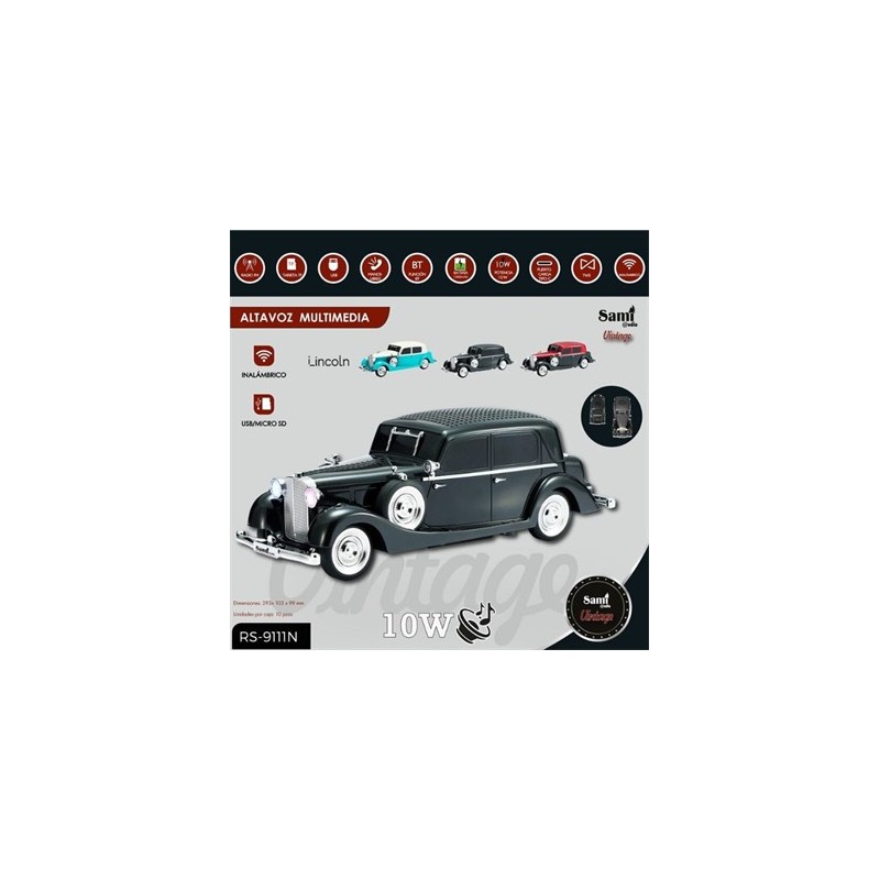 Altavoz Sami Vintage lincoln azul multimedia 1Altavoz multimedia Sami RS9111N con diseño clásico tipo Lincoln, potencia 10W, conexión Bluetooth, radio FM, USB/microSD y función TWS. Color negro. Ref. RS9111N de SAMIEAN: 8435128475300El altavoz multimedia Sami RS9111N destaca por su elegante diseño retro inspirado en los automóviles Lincoln clásicos, presentado en color negro.Con una potencia de 10W, ofrece un sonido potente y versátil gracias a sus múltiples opciones de reproducción: Bluetooth, radio FM, tarjeta microSD y puerto USB.Además, incorpora función TWS para emparejar dos altavoces y disfrutar de sonido estéreo envolvente. Su batería recargable de litio garantiza autonomía, mientras que el puerto de carga tipo C proporciona rapidez y comodidad.Un modelo perfecto para los amantes del estilo vintage con la tecnología actual.Especificaciones técnicas:Marca: Sami Audio (Vintage).Modelo: RS9111N.Tipo: altavoz multimedia inalámbrico con diseño clásico Lincoln.Potencia: 10W.Conectividad: Bluetooth, USB, microSD, radio FM.Funciones: TWS (True Wireless Stereo), manos libres, reproducción MP3.Batería: recargable de litio.Puerto de carga: tipo C.Diseño: automóvil Lincoln retro.Color principal: azul.Dimensiones: 293 × 103 × 99 mm.